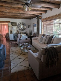 Some of the original Spanish influences include heavy hand-hewn wood doors, beveled glass doors, wrought iron fixtures, stained glass, original Saltillo floors & rustic log beam(ed) ceilings, & a sink vanity set in an old hand-carved Spanish desk. Some of the modern amenities include the new propane log stove for chilly evenings, a reimagined fully equipped kitchen w/vintage hand-carved cabinetry, a cooking island, leather-look Quartzite counters, GE Profile appliances, Keurig hot/cold brew coffeemaker, toaster, blender, & all the pots & pans, dinnerware, glassware, & flatware you will need.