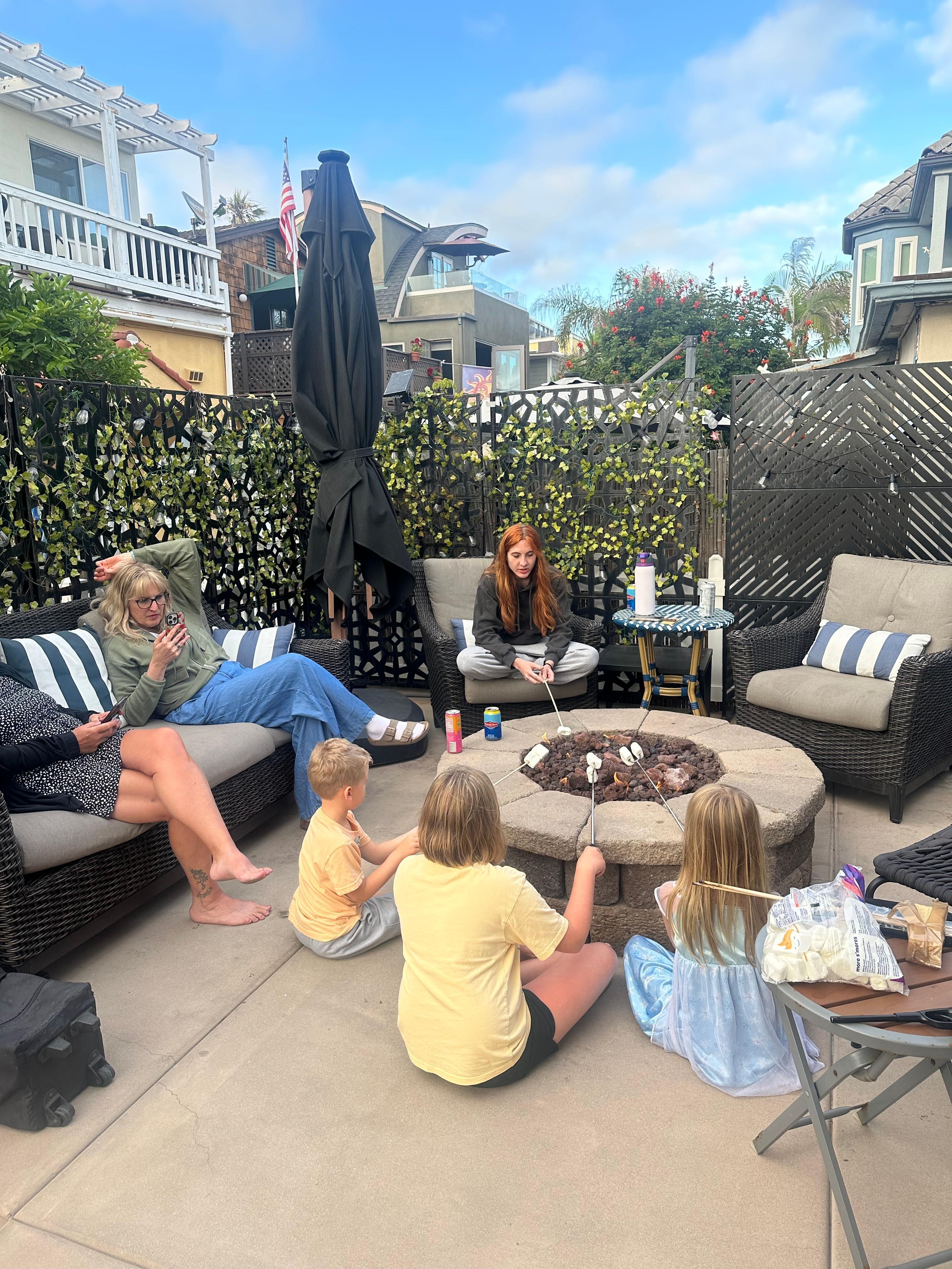 Sliding glass doors open to Patio with BBQ and Firepit and seating for entire group