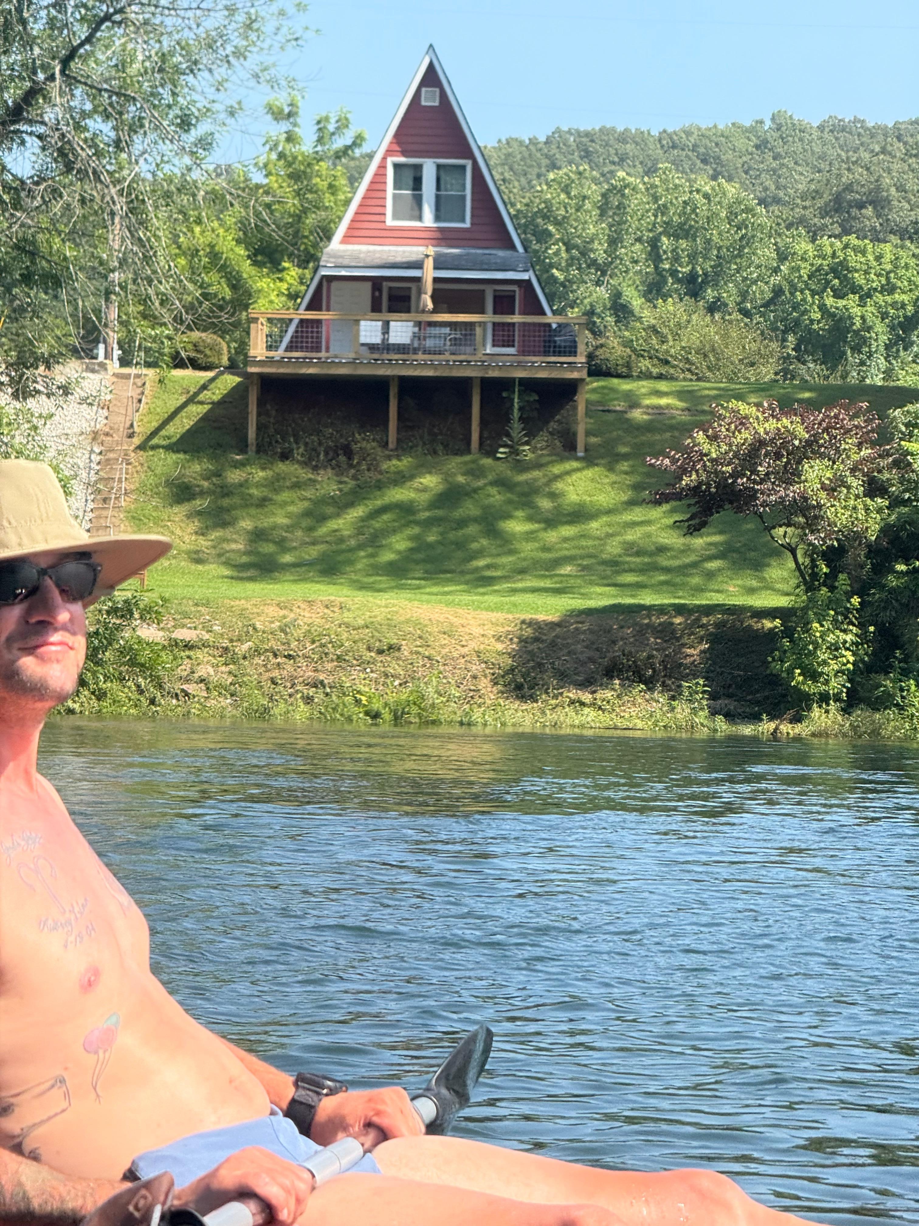 This "A-Frame" chalet sits on the bank of the famous White River in Gassville, AR. There is approximately 500 sq. feet downstairs that includes a full kitchen, bathroom with a shower, and a washer and dryer. There is a living room and a futon for an additional bed downstairs. There is 280 sq. feet upstairs that includes a queen bed and two twin beds. Both levels have a 32" flat screen TV with Dish services. There is also a nice outdoor living space with a covered porch and a large deck.