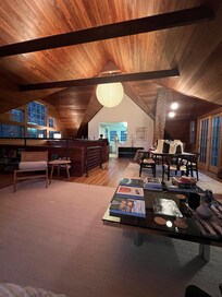 Set on a sprawling 1.36-acre lot, this exceptional home is nestled south of the highway, just five minutes from Southampton Village. Boasting three bedrooms and two baths, this home features an updated vintage exterior and a series of decks and balconies that provide a remarkably flexible layout. As soon as you step inside, you'll be greeted by a cozy ambiance that's sure to make you feel right at home. The main living space is truly breathtaking, with cedar wrapped cathedral ceilings and exposed beams that provide a dramatic living space. Natural light pours in from the many windows and balconies throughout the open floor plan of the living and dining rooms, making for an inviting living atmosphere. The galley kitchen features top-of-the-line wolf and subzero stainless-steel appliances, perfect for whipping up gourmet meals to share with friends and family.