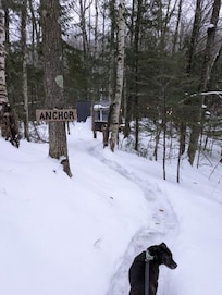 The campground is spread out over 5 acres of forest on Bresette Hill Road. After parking at the trailhead, youâll gather your bags and hike into your glamping site. The trail winds through the woods, leading you first to a valley where the seasonal Clark Creek runs through in the spring. The first two campsites are on the other side of this valley. The trail can be steep in spots and requires a moderate level of fitness and mobility to reach the secluded campsites. The third site is a bit farther into the forest, the little A-frame cabin, Anchor sits on the edge of the spring-fed Brickyard Creek that flows year-round.