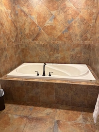Every morning you're here, you can wake up to lake views from the master bedroom. We've furnished it with an extremely comfortable king-sized bed, light and bright workspace by the window with desk and office chair, a super comfy recliner, your own TV in the armoire, walk-in closet, spa-like tiled shower, and a large jetted tub.