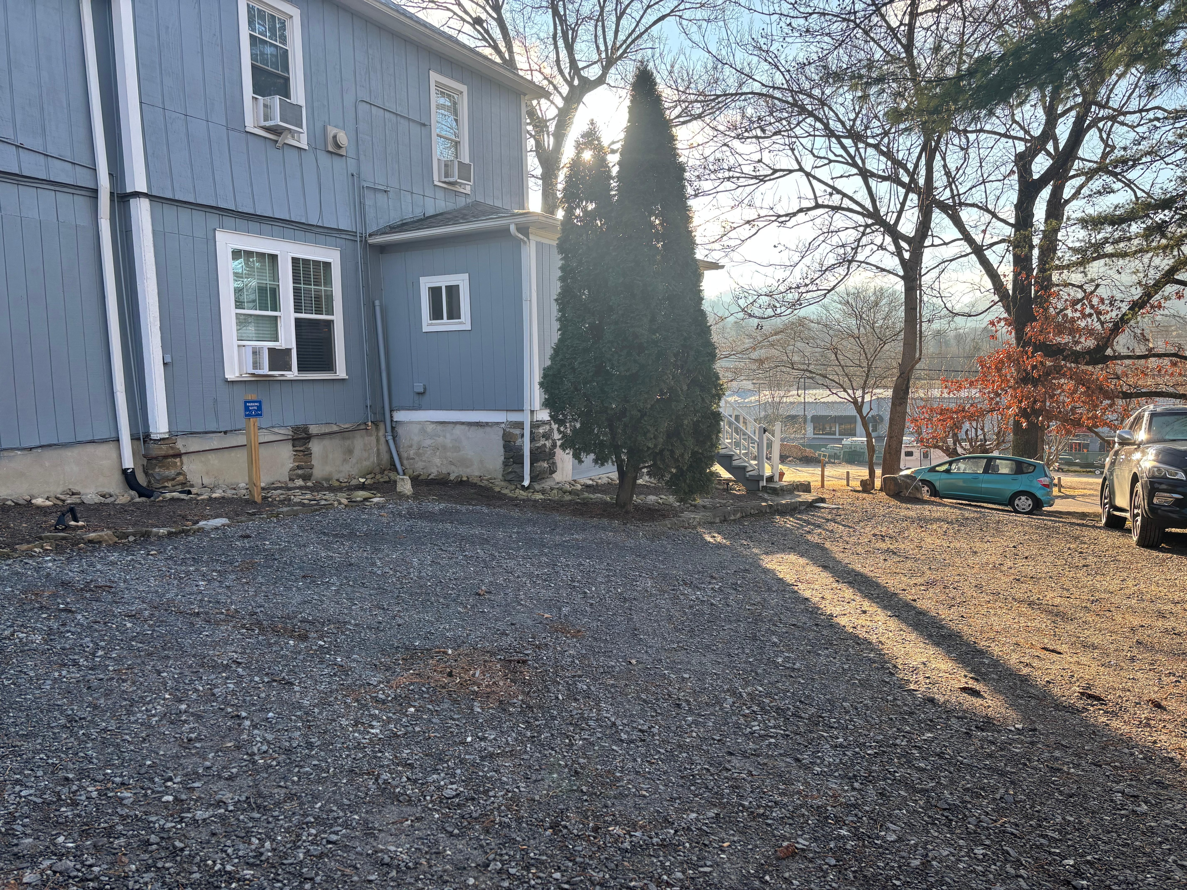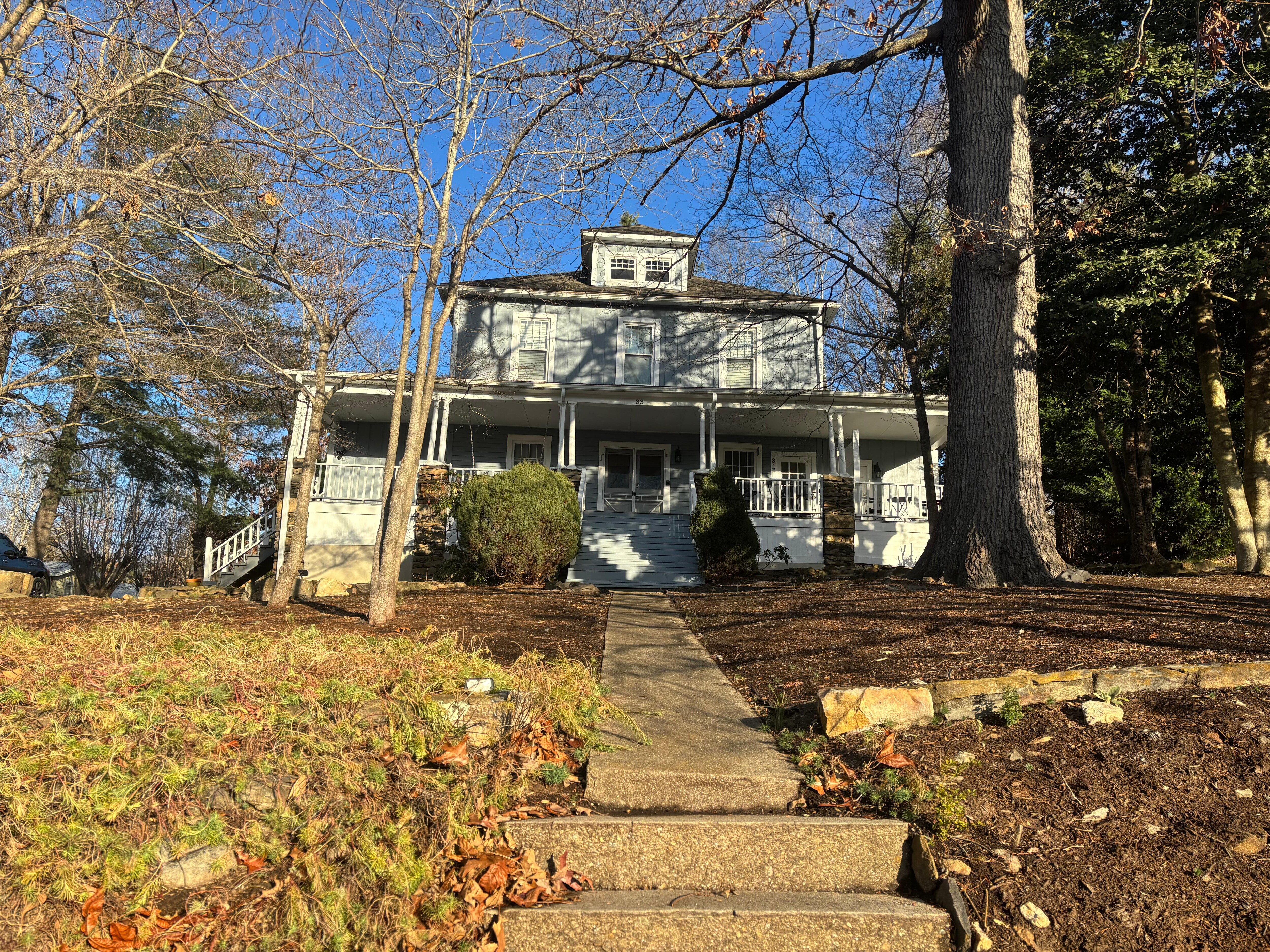 Black Mountain Lodge has five units, each with a separate entrance. The door for Unit 1 is in the center of the front porch. There are steps that lead up to the porch.