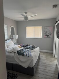 Welcome to bedroom number 1, a haven of relaxation with its expansive king-sized bed, eagerly awaiting your presence. Check out your outfits for the day in the full-size mirror cleverly integrated into the closet area. This beautiful room invites you to unwind with a direct view of the wall-mounted 55” HDTV with Roku from the comfort of your bed. But that’s not all, you will also have an ensuite bathroom - this bathroom is also accessed from the hall.