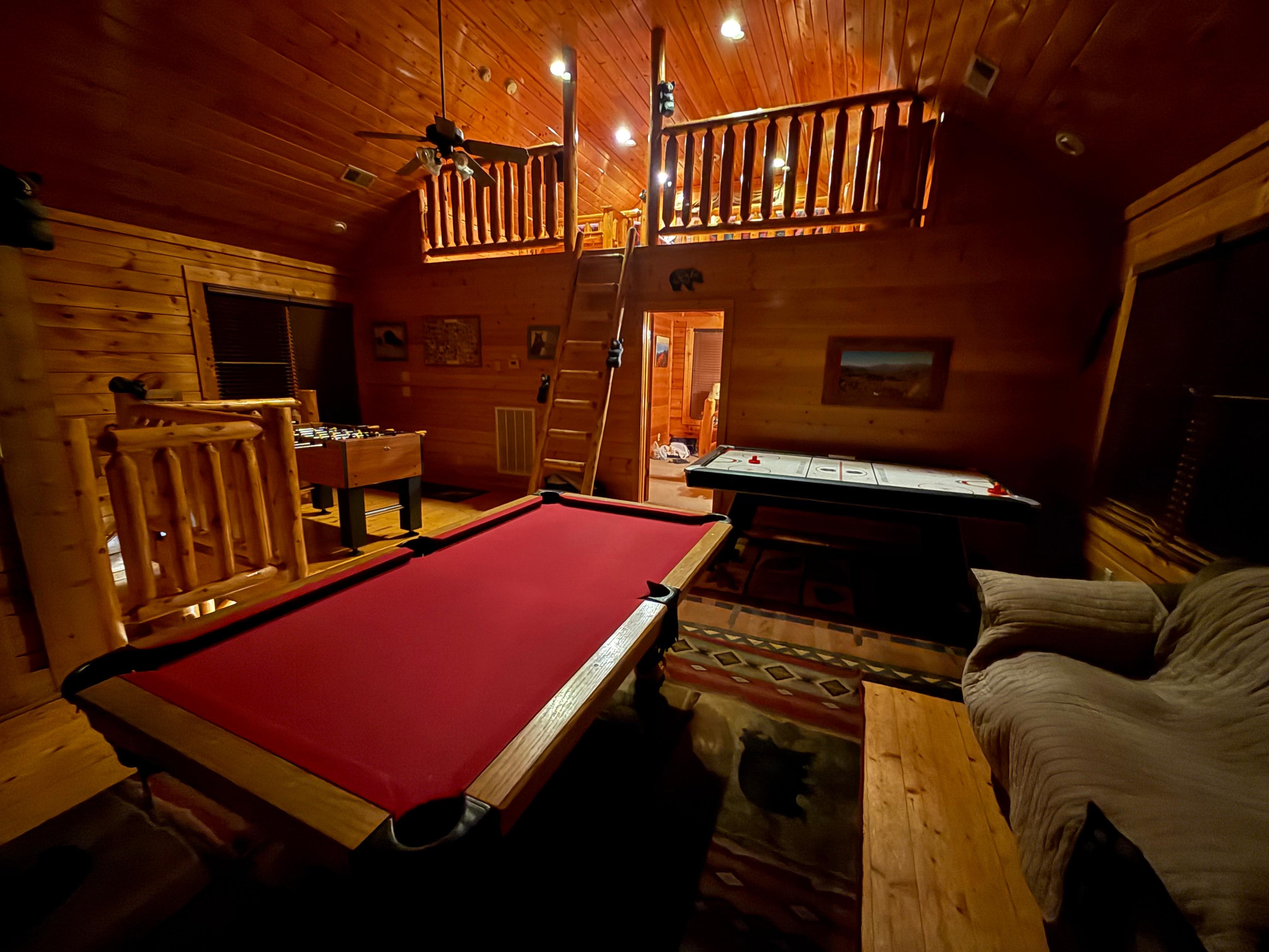 Bears vraiment ne manquent pas dans cette chambre confortable 2+, 2 salle de bains cabine de luxe. Assez petit pour servir une escapade de votre rĂȘve couple romantique, mais assez grand pour dormir 8-10 pour les grandes rencontres familiales, Abound Bears est le meilleur endroit pour profiter de la vue majestueuse de la Great Smoky Mountains. DĂ©tendez-vous et profiter de la vue imprenable depuis notre jacuzzi bouillonnant ou profiter de la mĂȘme vue spectaculaire Ă partir d'une chaise Ă bascule de dĂ©tente sur le pont au deuxiĂšme Ă©tage. Bears Abound dispose de deux suites de maĂźtre privĂ©s avec des lits king-size et salles de bain complĂštes. La deuxiĂšme suite de maĂźtre de niveau a Ă©galement, un bain Ă remous intĂ©rieur privĂ©. Pour les enfants (ou les jeunes au coeur), il ya un "loft in-a-loft" avec 2 lits queen-size et un «nid de corbeau" avec un futon pleine grandeur. Si vous aimez les jeux, Bears Abound ne vous dĂ©cevra pas! Vous avez le choix de baby-foot, le hockey et la piscine de l'air. Pour ceux qui prĂ©fĂšrent la paix et la tranquillitĂ©, imaginez le curling avec un bon livre en face de la fenĂȘtre de l'image ou se blottir devant la cheminĂ©e avec les Great Smoky Mountains comme toile de fond. Vous recevrez gratuitement Ă Internet haut dĂ©bit / WIFI, accĂšs Ă la piscine de la station et 24 heures / salle de vapeur des installations d'exercice. Bears Abound a tout!