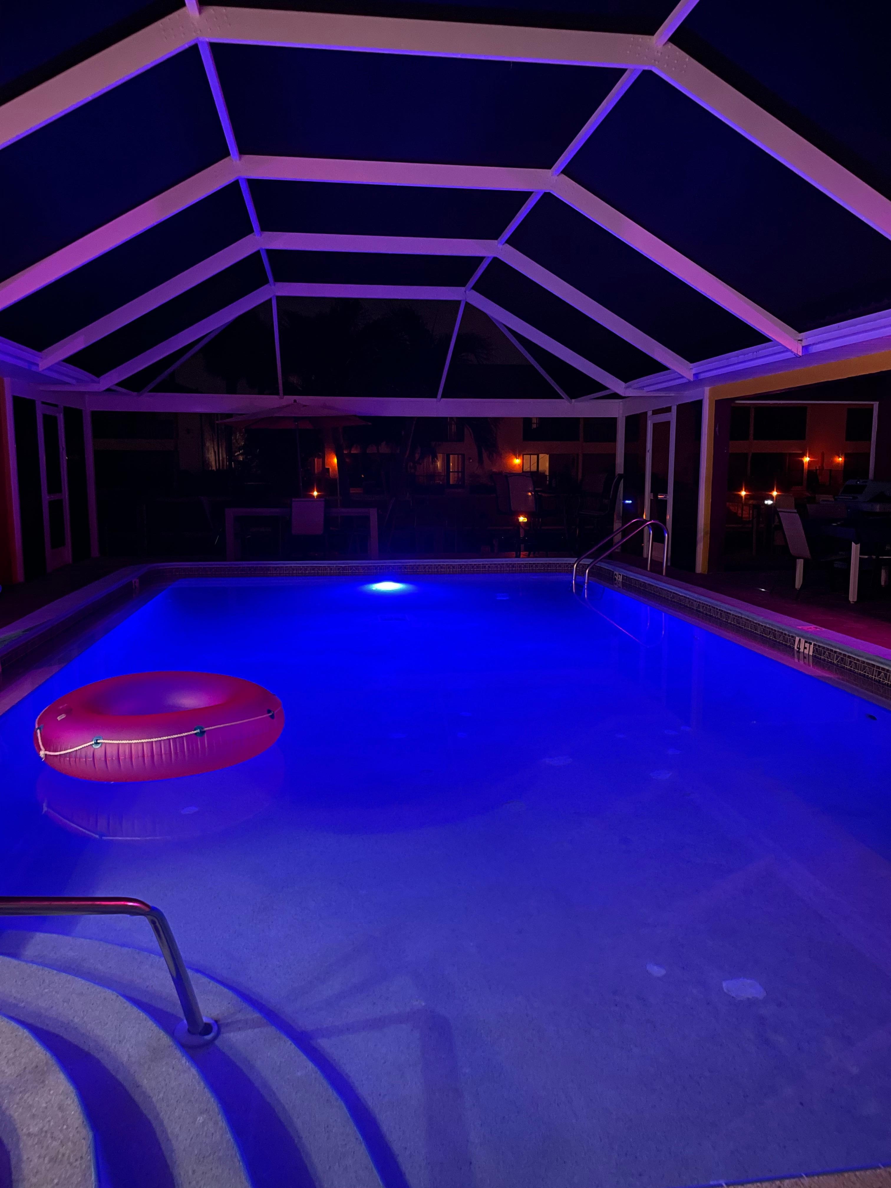 * A stunning heated saltwater pool and integrated hot tub, which comes alive at night with colorful lights.