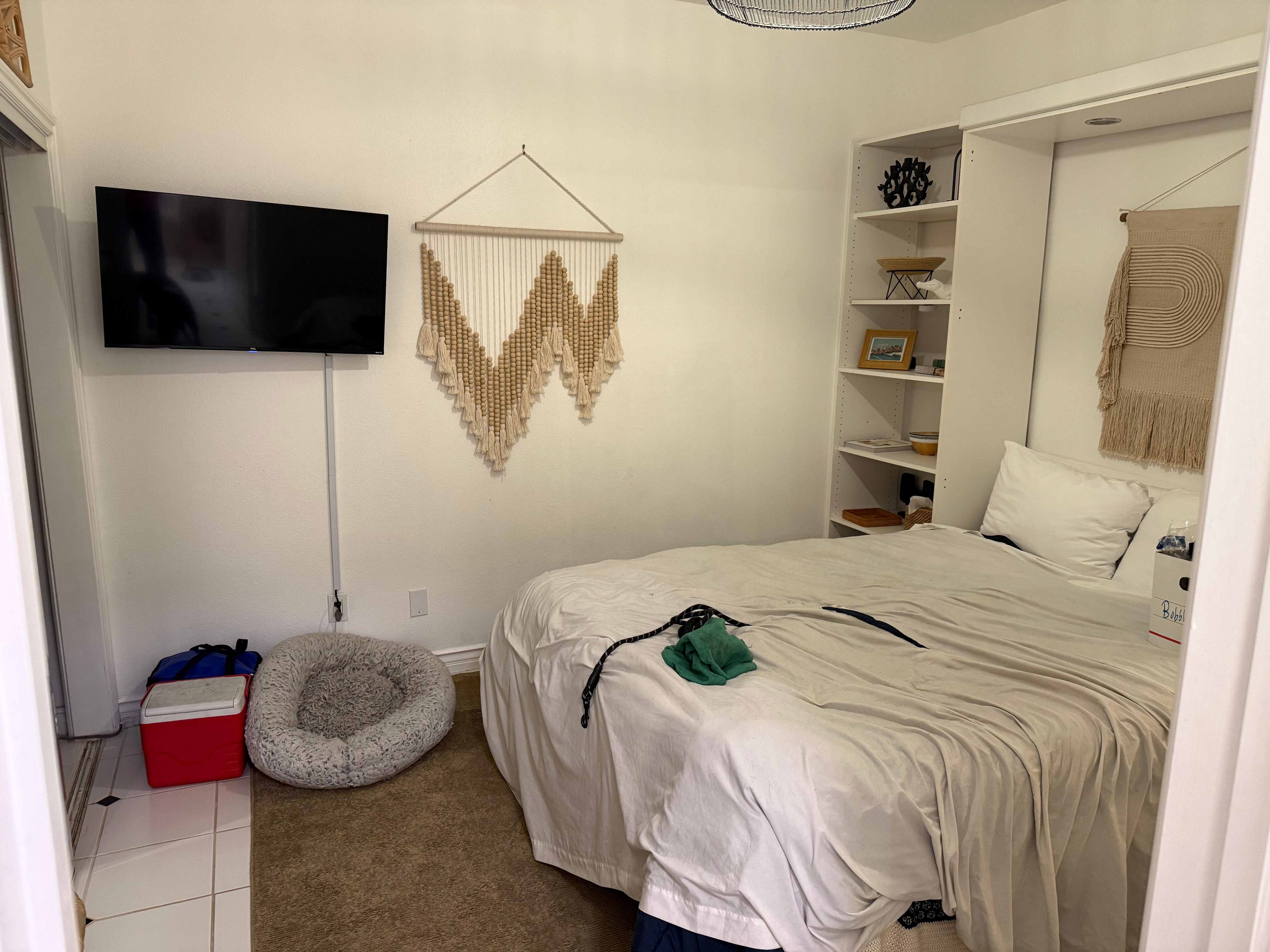 Inside, you'll find a freshly adorned bedroom with chic beach-style furnishings and a cozy queen bed, perfect for unwinding after a day of sun and sand. A wall-mounted TV offers easy late-night viewing, and ample closet space ensures you can settle in comfortably. A dedicated workspace and mini fridge are also provided to make your stay as seamless as possible.