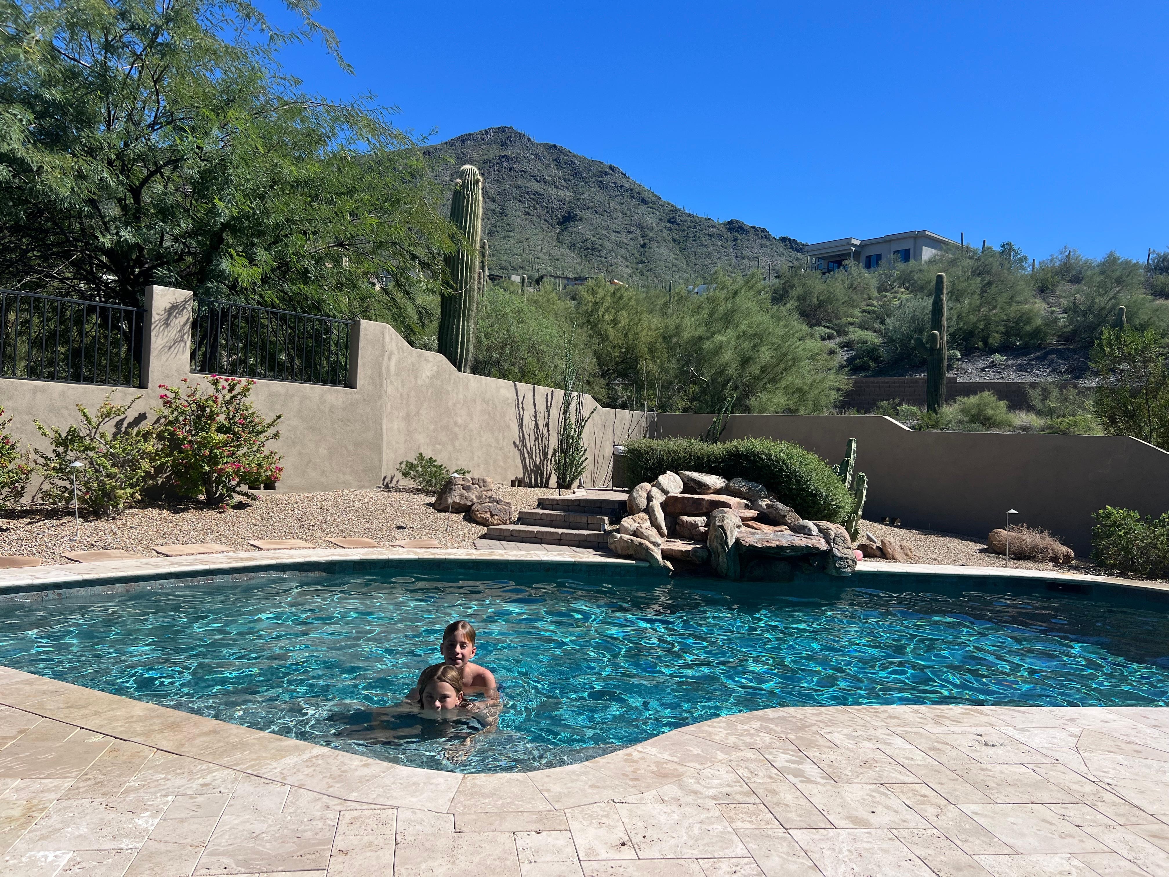 Located in the beautiful Sonoran Desert surrounded by Saguaro Cacti, we welcome you to our luxurious oasis in Cave Creek, which borders North Scottsdale and backs up to Black Mountain. Sleeps 12. 4 bedroom/3 bathrooms (two full, one half). Owner managed for the personal touch. Walk to the nearby trailhead for one of AZ's best and scenic hikes! Stroll into town to enjoy Cave Creek/Carefreeâ s night life, fabulous restaurants and shopping. Our luxury property is the perfect retreat for families, friends or anyone looking for a relaxing getaway. Our property features an evening shaded backyard with something for everyone, including a heated pool (+$75/night - please request at least one week before arrival), hot tub, peaceful waterfall, BBQ and outdoor TV. Gorgeous sunsets. Surrounded by mountain views. The home itself is thoughtfully designed and includes 4 bedrooms and 3 bathrooms. Fully stocked kitchen, luxury bath amenities. Pool towels, pool floats for lounging, All new southwest designer furnishings and accessories. Plenty of outdoor seating and outdoor fire pit. Upscale neighborhood. For entertainment, there's a game room located in the garage with a ping pong, air hockey, and a basketball arcade game, offering hours of play time for all ages!
