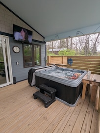 We are nestled in the woods, with the sounds of birds and pond all around. You may even hear the neighborâs chickens, goats, or the occasional train a mile away. We have some nice amenities, like soaking in the hot tub on the covered deck while watching tv. If you like to go do stuff-thereâs plenty of stuff within a 20 minute drive!