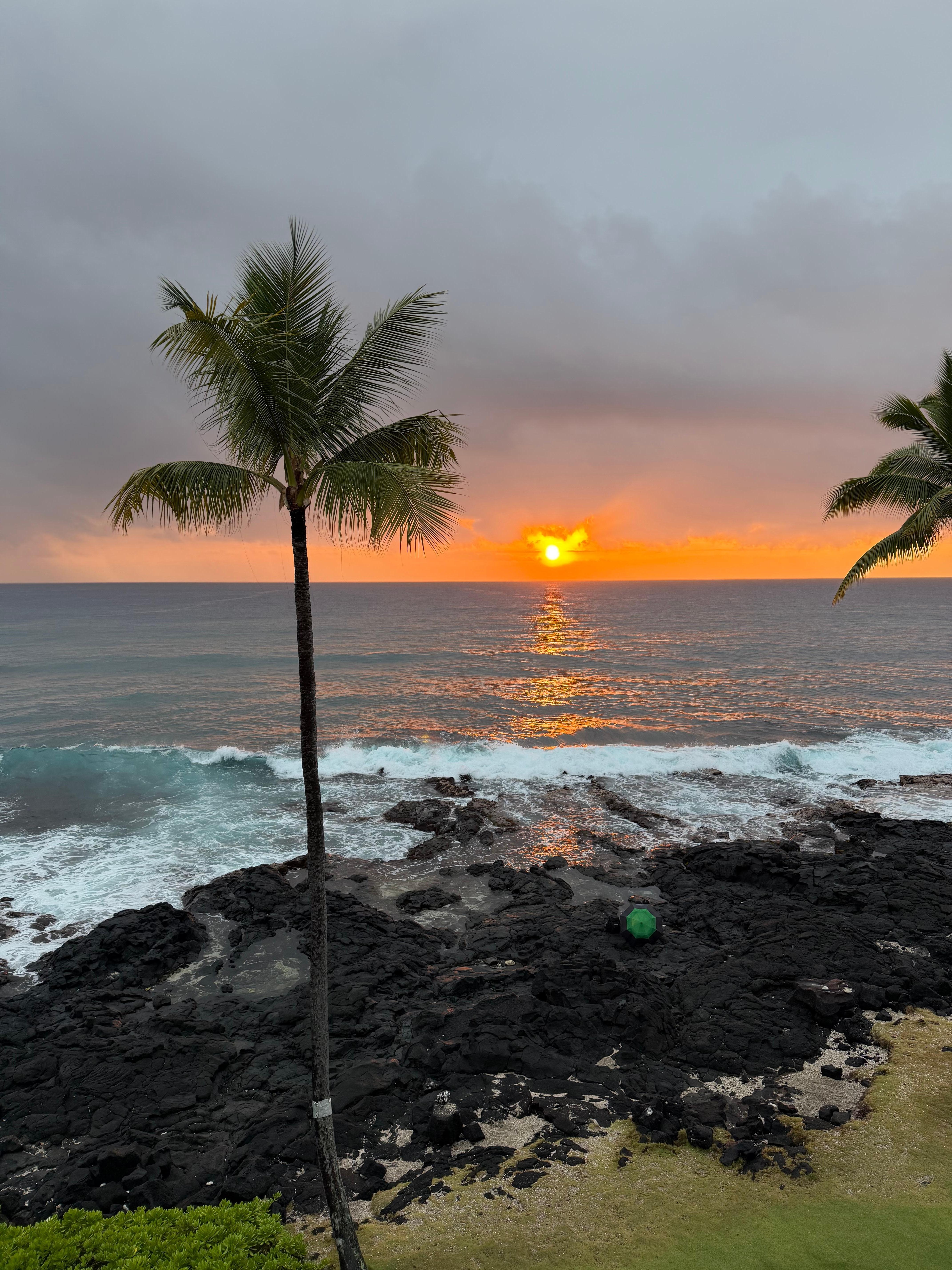 Condo is newly redecorated in a stunning matching volcano and beautiful sunset theme! From our direct oceanfront top floor condo, you can enjoy the close-up sights and sounds of the ocean all day long, as the waves come rolling in right in front of you and crash on the black rocks.