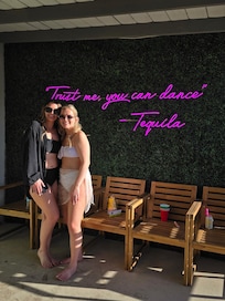 For that unique IG photo, we have two giant egg chairs, outdoor dining in front of our custom neon sign, a pool with six sun loungers (pool floaties not provided), a gazebo with two couches and a love seat, a ping pong table, corn hole, a firepit, and giant Jenga.