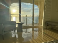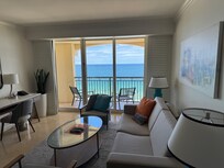 Détendez-vous sur le balcon de 30 pieds en bord de mer de notre suite complÚte d'une chambre (convertible 2br), deux salles de bain tout en marbre avec cuisine complÚte et coin repas. La chambre est décorée avec une élégance simple pour améliorer la vue sur l'océan.