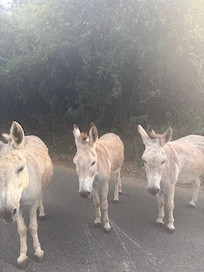 We love to sit out on the deck and watch what we call "Fish TV" at the "dive bar". We watch schools of fish swim around and get chased by barracuda. There are big rays in the water as well- and we love watching the birds dive down for snack-time. We see geckos around the property (they are friend, not foe!) and we have iguanas that live in the wild areas around the villa. We see deer regularly- it is just nature in abundance. We also have wild donkeys and goats that visit the villa from time to time.