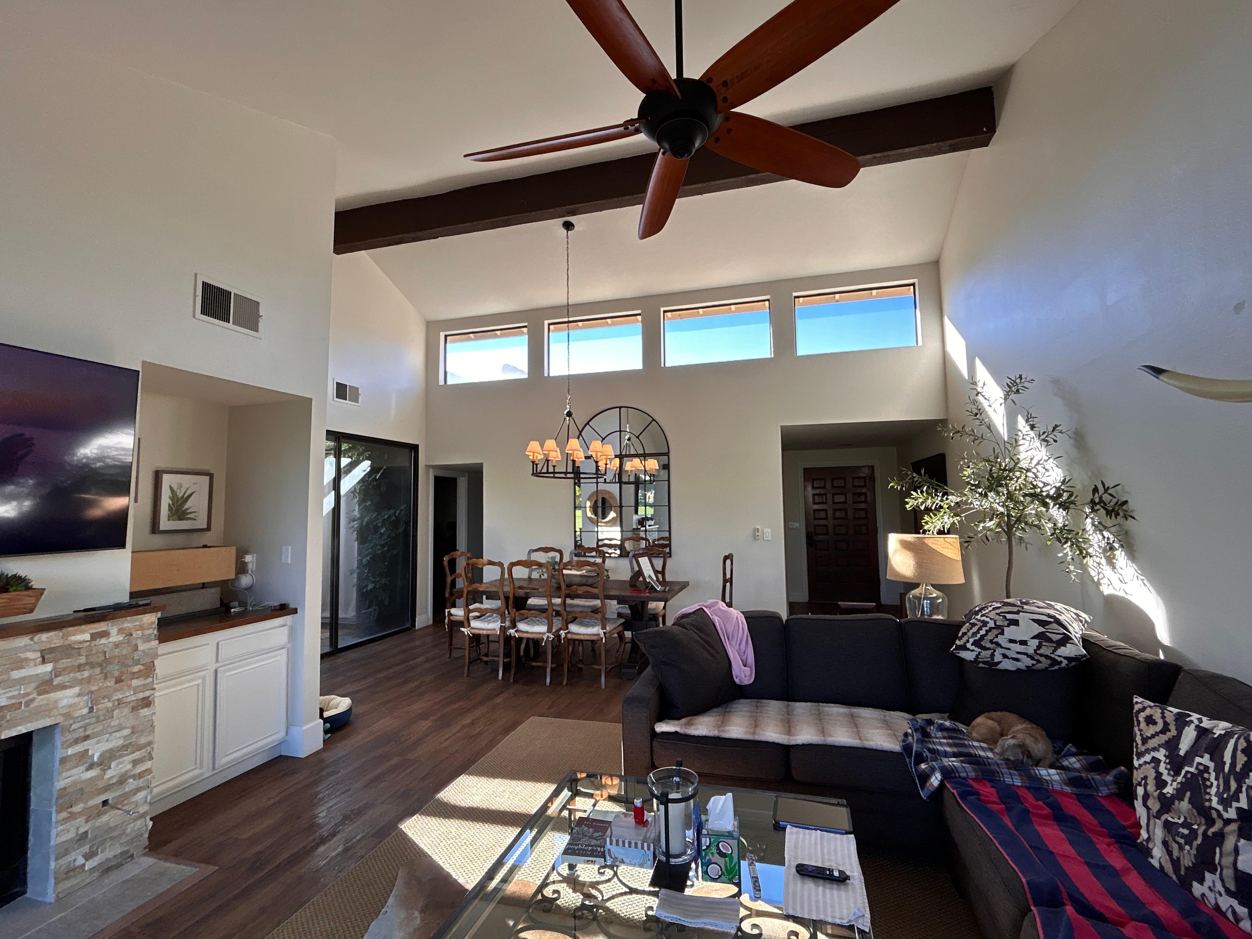 Tastefully decorated, comfortable, updated (99%) condo in established well-known golf country club community in a central location, close to El Paseo. Living room, dining area, kitchen, bedrooms and the two bathrooms all include many thoughtful details for living -- large comfortable sofa, great dining area with large table, seating for six and attractive modern chandelier. Exceptionally well-equipped kitchen. Lighting where you need it. Condo also gets good natural light throughout and AC works like a charm. Full size washer/dryer (didn't use). Lighting (ceiling and task) is good, and where you need it. Patio is large and overlooks the golf course (north-ish? orientation, almost full sun in the morning in October, mixed in the afternoon) with views over the golf course and a small lake with fountain. Like everything else, the patio (a good slize) is thoughtfully done, with a lovely patio table with chairs for 6, plus 2 lounges and gas fire pit (though we didn't use it). This is clearly a condo "home" that is lived in by the owners, and not a quickly decorated "rental for show piece". A few things (e.g., tub in 2nd bath) have not been completely updated, but the livability of the home was a major benefit. Communication with owner was super easy - check-in and check-out. We finalized check-in details while travelling in Europe - couldn't have been easier. Thank you!