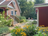 A fairy tale chalet set in a tranquil lakeside garden. Relax on the hammock with a book and a glass of wine. Snuggle up by the fireplace and enjoy a glowing fire and a cup of cocoa. An enchanting oasis of tranquility on a quiet Michigan lake just five minutes from exciting downtown Saugatuck... Have you always wanted to be the star of your very own Nancy Meyers' romcom (think 'The Holiday'!)? If so, then consider this cozy red chalet, nestled in the heart of Saugatuck, to serve as the perfect backdrop. Whether you're looking for relaxation, fun, adventure and/or a peaceful place to write your next novel or paint your next masterpiece, consider this house your home away from home while you visit Saugatuck. This beautiful property boasts 3 bedrooms - one with a king bed and an en suite bath, one with two full beds and an en suite bath (+ walk-in closet), and one with a cozy queen size sofa bed. With 3 full bathrooms and a powder room equipped with all the essentials, you'll feel right at home. Relax and enjoy a bubble bath in the beautiful, brand new soaking tub upstairs, cook a cozy homemade meal in the spacious open kitchen, and enjoy slow mornings (with a big mug of coffee, of course!) in a hammock on the back patio surrounded by nature. A spacious finished basement offers a full bathroom with shower, a massive u-shaped sectional for the perfect movie night, as well as a home office equipped with a standing desk, desk chair and monitor. Each room from the home boasts beautiful wooded views. Please note that there is not a water view from the house. Walk down a short wooded path to a stairway that leads to your own private dock on Silver Lake! Drive or bike five minutes right into town to everything Saugatuck has to offer. Ten minute drive to beautiful Oval Beach! By renting this property, you are agreeing to the following terms: