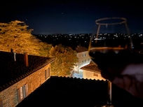 Relaxing on the terrace with a glass of wine, enjoying the unique view of the town, Crete Senesi, and Val d'Orcia. Walking home from a nice lunch or dinner without worrying driving under the influence. Fetching grocery and deli supplies in a minute.