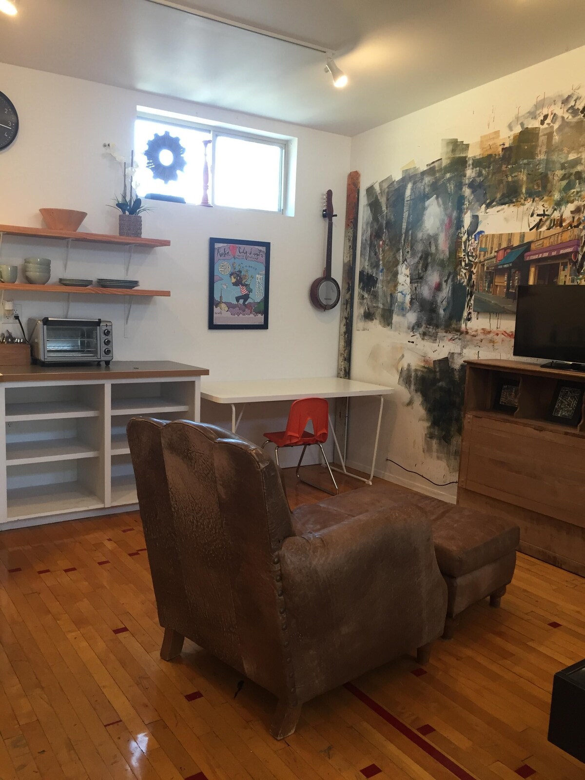 Le propriétaire d'origine était un architecte et un artiste. Il a conçu la maison et le studio était son véritable studio d'art. Vous pouvez toujours voir ses beaux coups de pinceau sur le mur. Le sol est un terrain de basket récupéré de l'Université Concordia, ce qui rend l'espace trÚs unique. L'espace comprend une kitchenette et une salle de bain complÚte avec de jolis carreaux rétro.