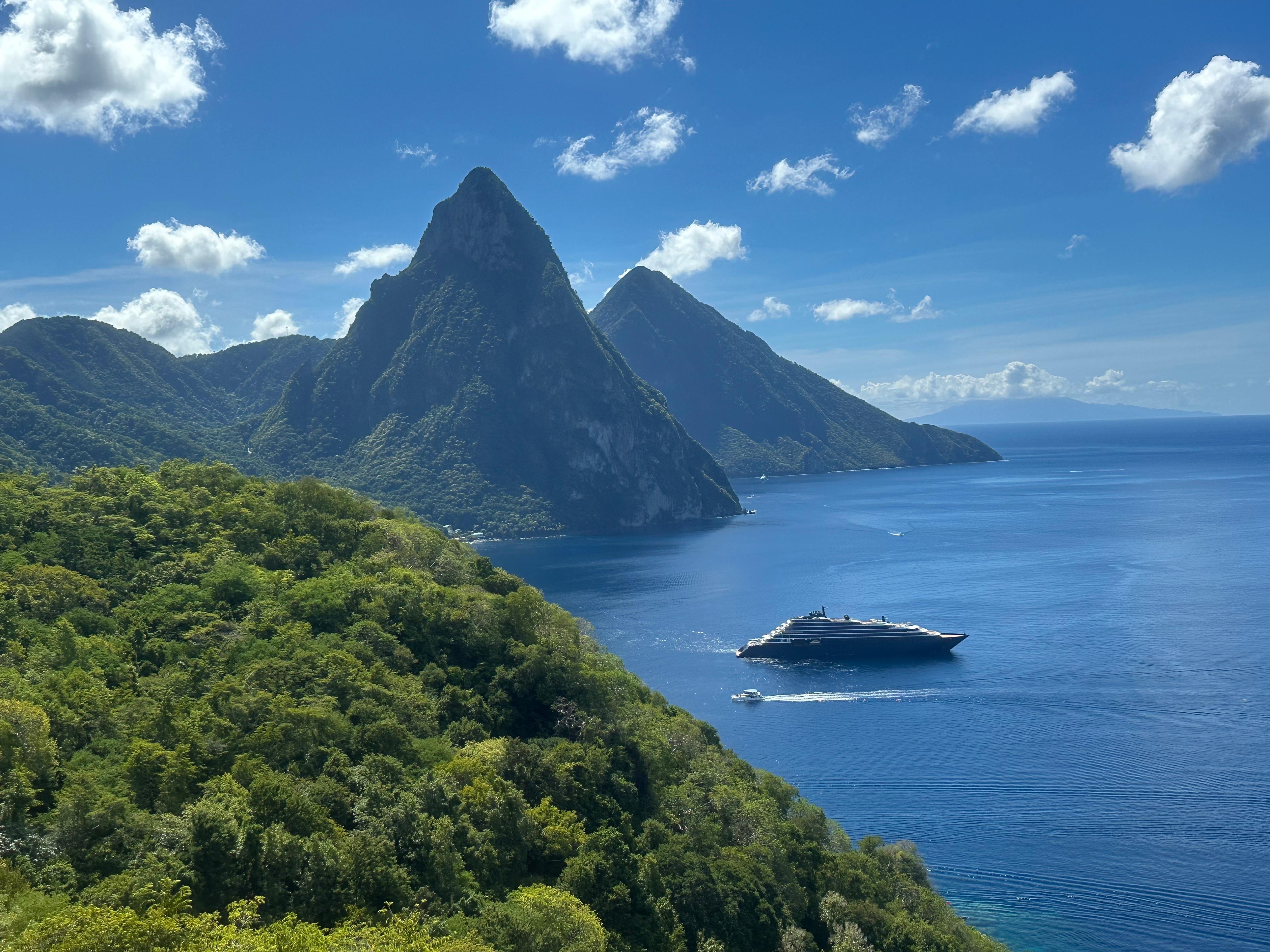 Le lendemain, poursuivez vos aventures en vous dirigeant au pied du plus haut sommet de l'île, le mont Gimie. Randonnez sur le sentier Enbas Saut et descendez 600 marches jusqu'à la cascade (puis remontez!). Ou si la plongée est votre passion, plongez plutôt dans "Vol de Superman" à la base du Piton. Prenez le temps de vous détendre un peu dans l'après-midi et visitez le volcan drive-in et les bains de boue noire, puis montez dans un catamaran pour une croisière au coucher de soleil avant de retourner à la villa pour manger un repas de poulet créole que Doxie a préparé pour vous.