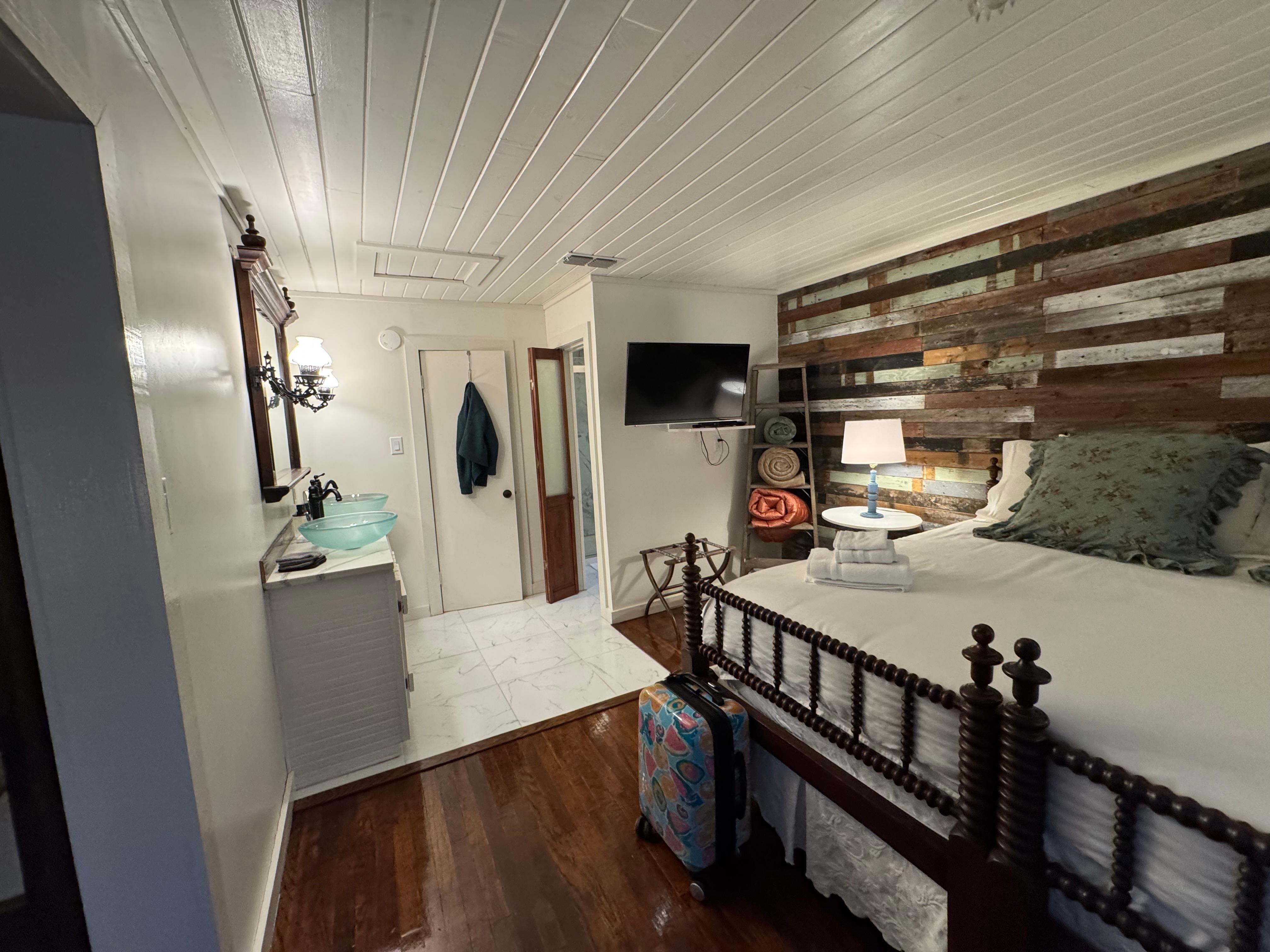 Stay comfortably in rural east texas at the Grand Saline salt capital. This 1-bedroom farm cabin. Is a cozy space featuring 1 king bed or optional 2 twin beds in the bedroom, along with a living room that includes a twin day bed and twin pop up trundle. Enjoy the convenience of amenities like central air and heat. The bathroom is equipped with a walk in shower and double vanity. Experience a fantastic getaway in this cute Jackrabbit and wild roses themed cabin. We look forward to you wandering in our neck of the woods!.