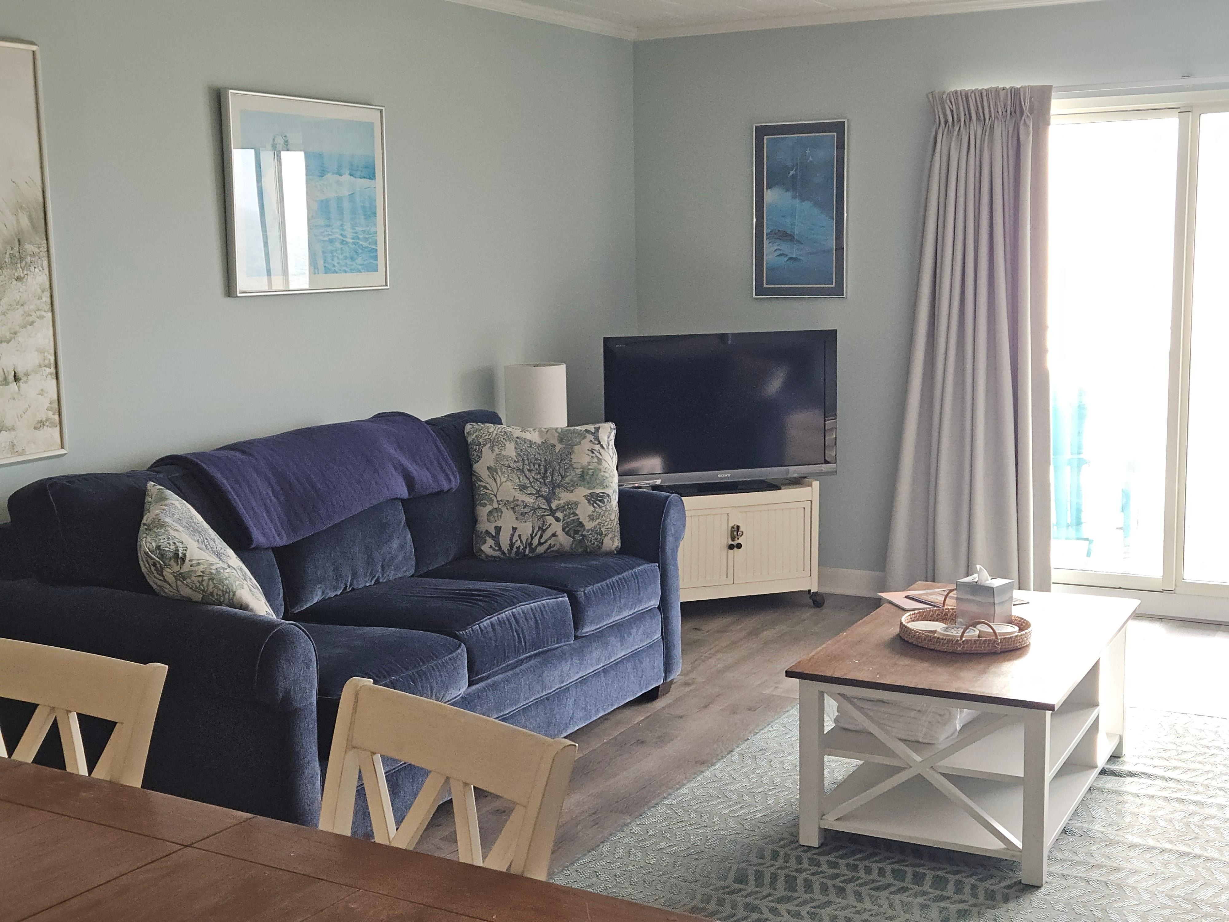 Inside, you’ll find an open and comfortable living space with central A/C, two TVs, and plenty of seating for relaxing after the beach. The fully equipped kitchen includes everything needed for easy meals, while the dining area flows naturally into the living room and out to your private balcony — offering front-row ocean views any time of day.