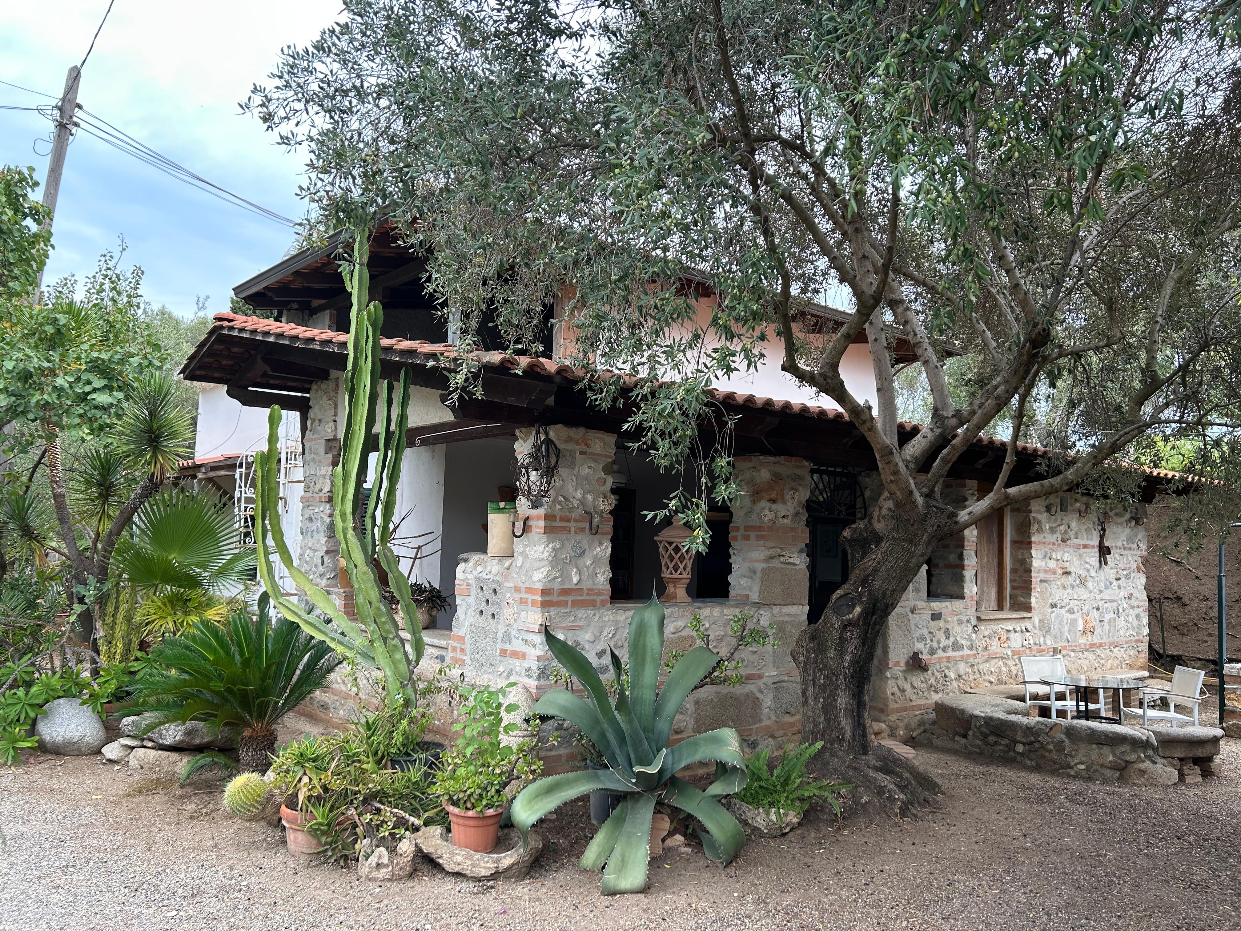 Dans le jardin joliment aménagé et abondant, poussent des bananiers, des petits cactus, des agaves et des oliviers et autres, en particulier des palmiers.
