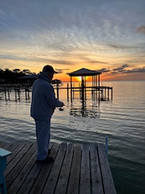 4 acres of peace and quiet on the water. Bird watching paradise. Fish from the dock or put in a canoe and paddle around the bay. Sitting on the huge screen porch watching the dolphin dance and fish...and pelicans and Great Blue Herons fish as well.
