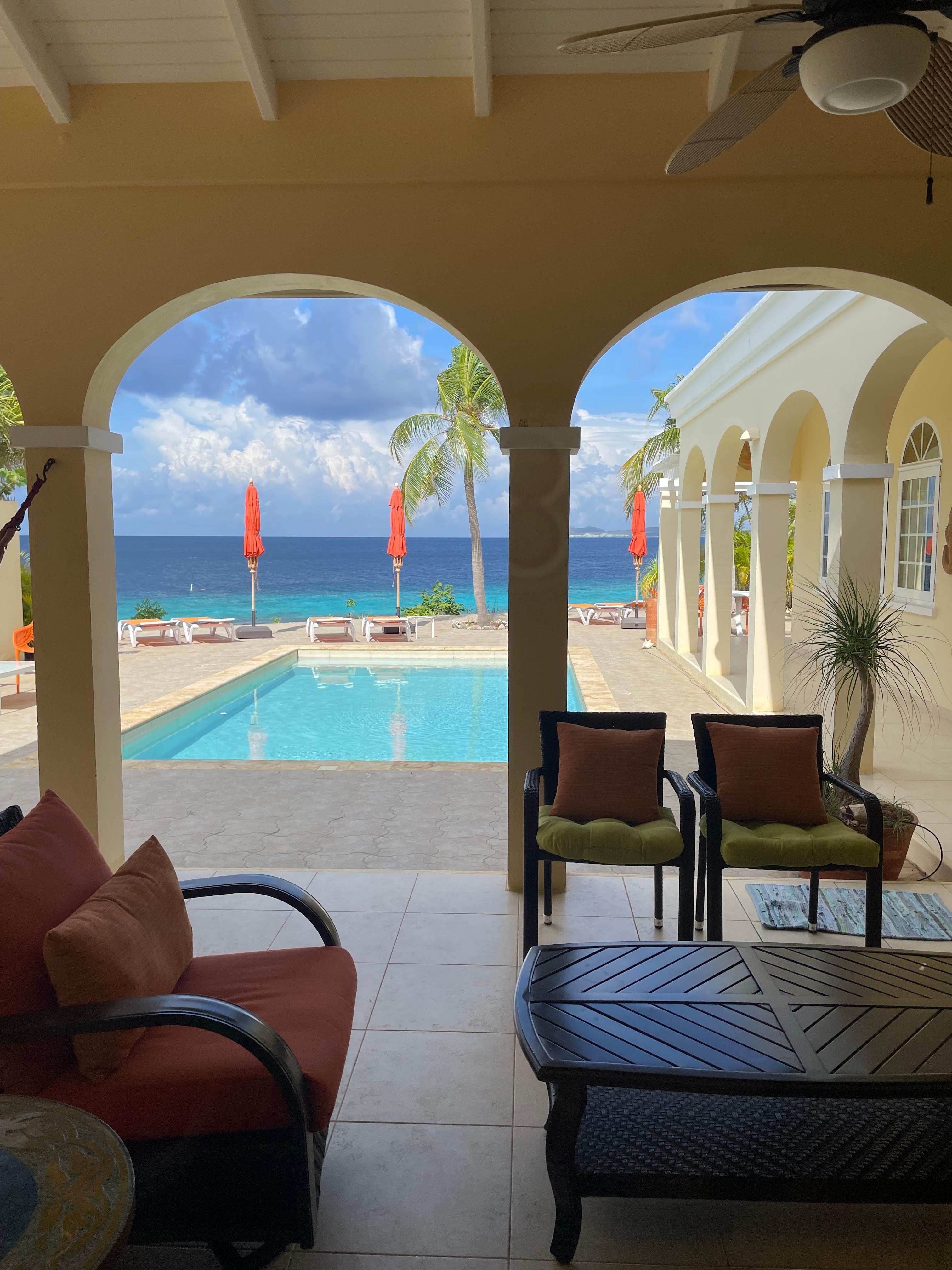 Les vues de cette fantastique villa face à l'océan commencent dÚs que vous vous promenez dans le jardin paysager et dans la porte d'entrée - en regardant à travers le décor lumineux du salon, à travers la véranda confortable et accueillante et au-dessus de la piscine rafraßchissante directement vers les magnifiques Caraïbes Mer. Le pont est un refuge accueillant avec chaises longues, hamac, palmiers et, le soir, de magnifiques couchers de soleil sur l'eau. Votre souffle et vos soucis vous seront enlevés!