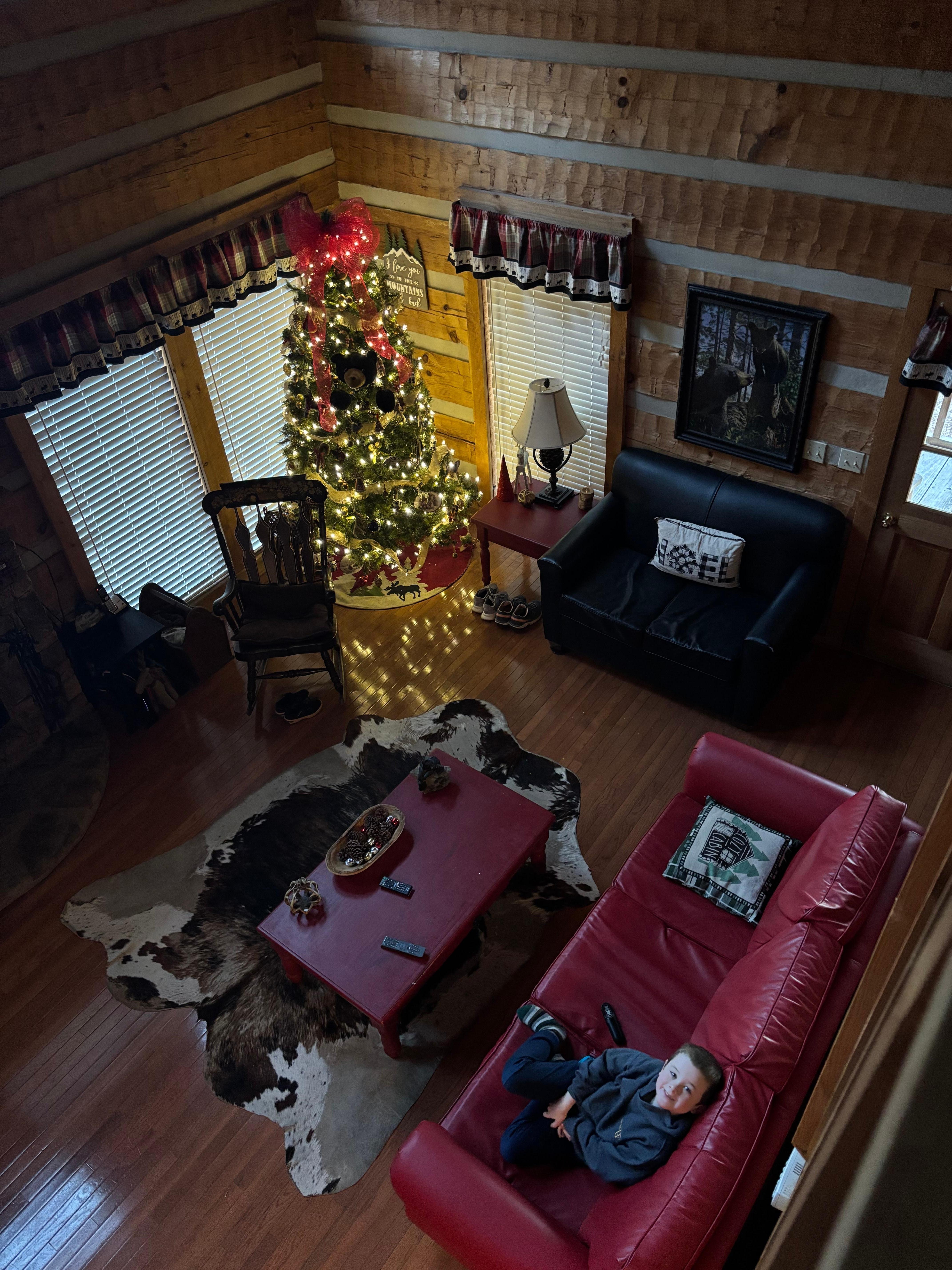 La cabine dispose d'un spacieux salon / salle Ă manger ouvert avec une belle cheminĂ©e en pierre empilĂ©e, du parquet, un canapĂ© en cuir, une tĂ©lĂ©vision 50 'Ă Ă©cran plat avec lecteur DVD et magnĂ©toscope, une cuisine Ă©quipĂ©e avec de nouveaux appareils modernes avec CafetiĂšre et cafetiĂšre Keurig et une salle Ă manger pouvant accueillir 6. La cabine dispose de grandes fenĂȘtres avec beaucoup de lumiĂšre naturelle.