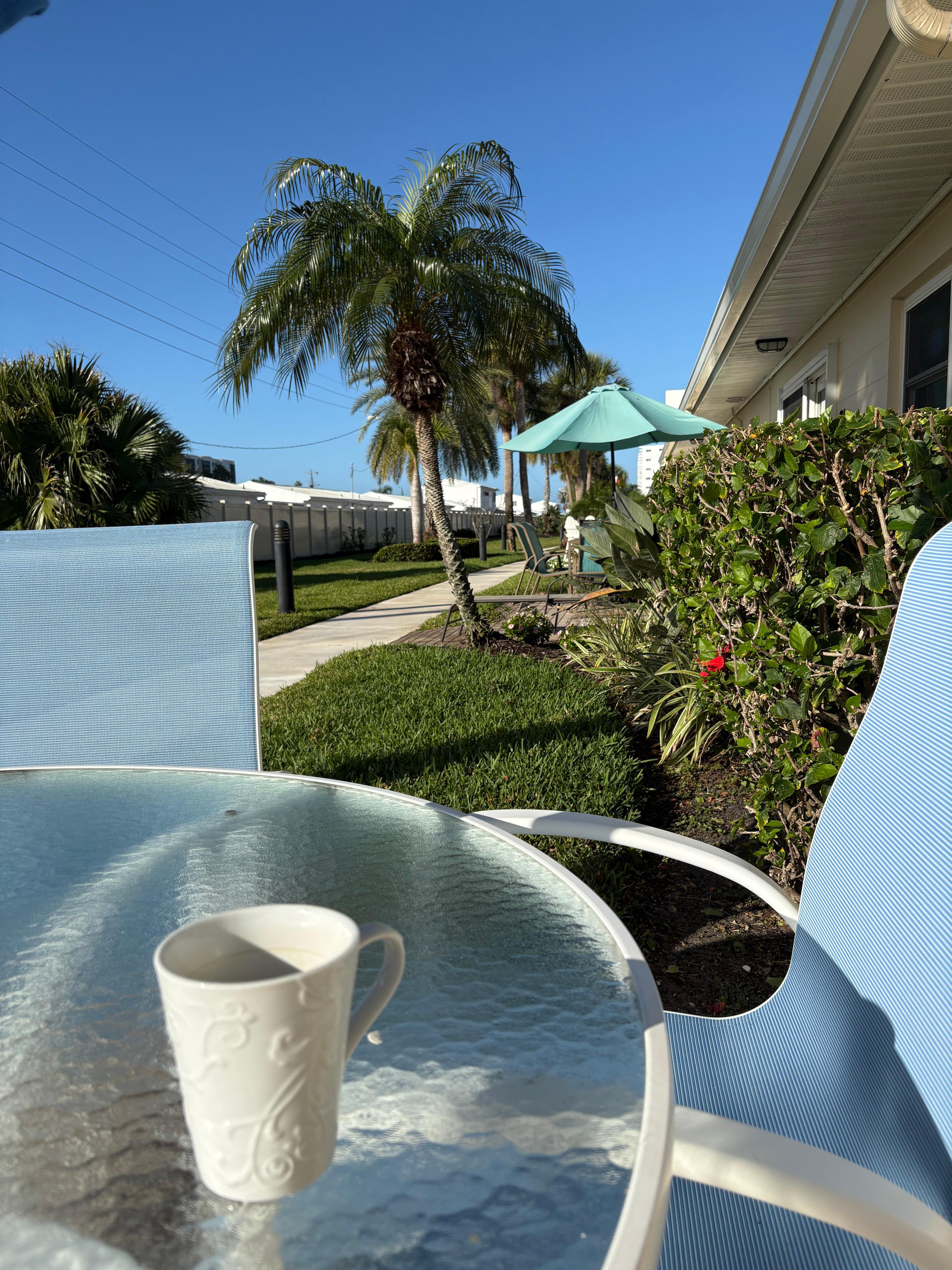 Le condo a une terrasse donnant sur le sud qui reçoit des quantités incroyables de soleil toute l'année. Contrairement à d'autres condos sur Siesta, le soleil n'est jamais bloqué ici par les gratte-ciel à proximité. L'espace entourant le patio est considéré comme un «jardin» et offre une intimité et une intimité que les unités prÚs des piscines et des allées piétonniÚres ne font pas. Le patio est également protégé du vent. Par temps frais ou venteux notre patio se sentira 10-20 degrés plus chaud que la plage. Nous avons (2) des chaises longues, (2) des tables de boissons, et (2) des chaises réguliÚres à l'extérieur pour l'utilisation. Il y a un trÚs grand barbecue à gaz en acier inoxydable situé à proximité pour votre usage.