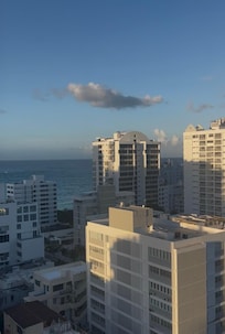 Extremely well located unit. Corner type unit with two floor to ceiling windows with great views south and east. Balcony faces east towards OceanPark and partial views to the ocean. Lovely re-done bath and very cozy ambiance. At night the lights are beautiful . Great location with Freshmart next door and major hotels and CVS right across. Kitchen small but works. Very nice greet and meet service with Maritza. The owner was good to work with. Great getaway place for a few days or more.