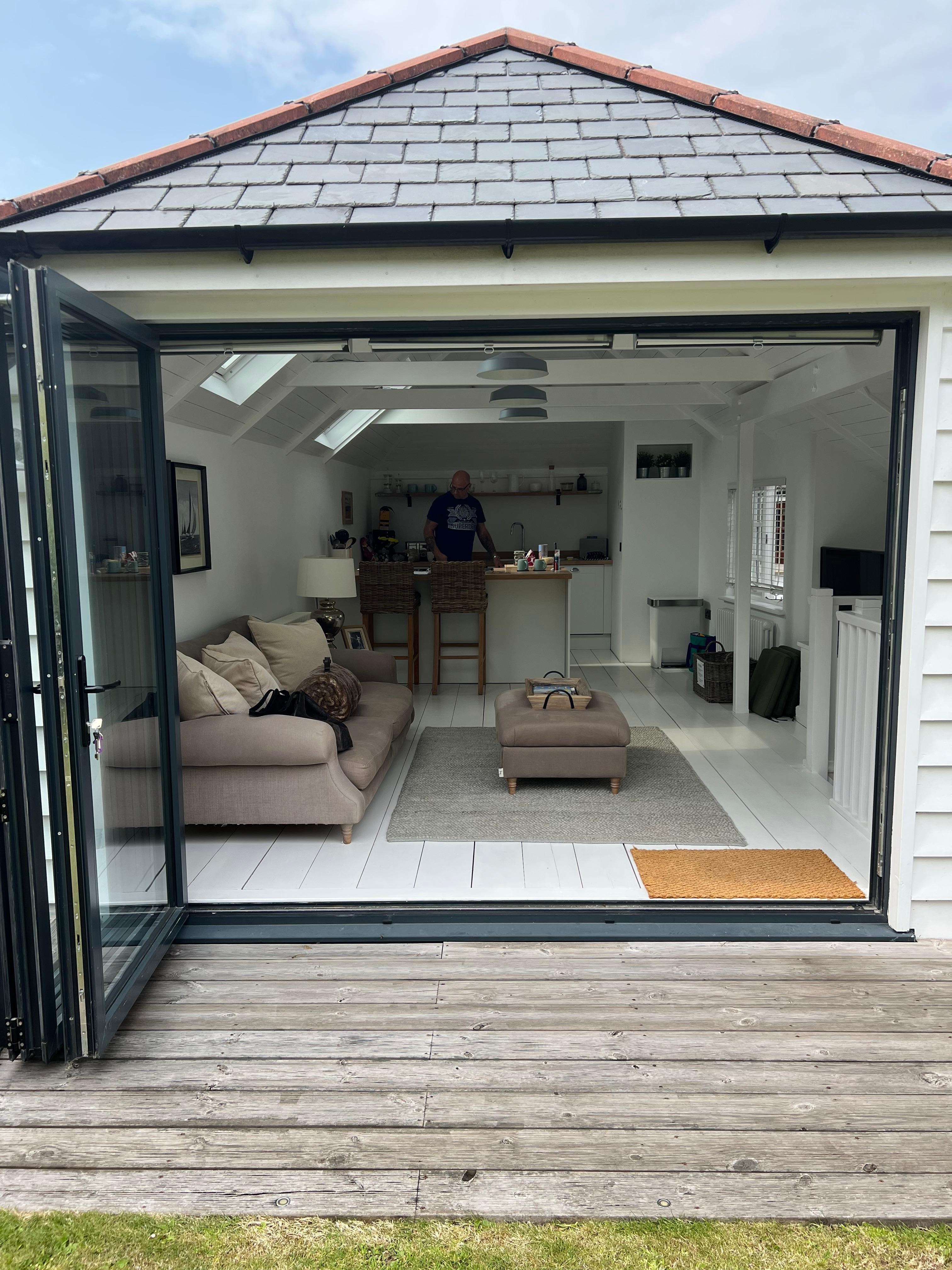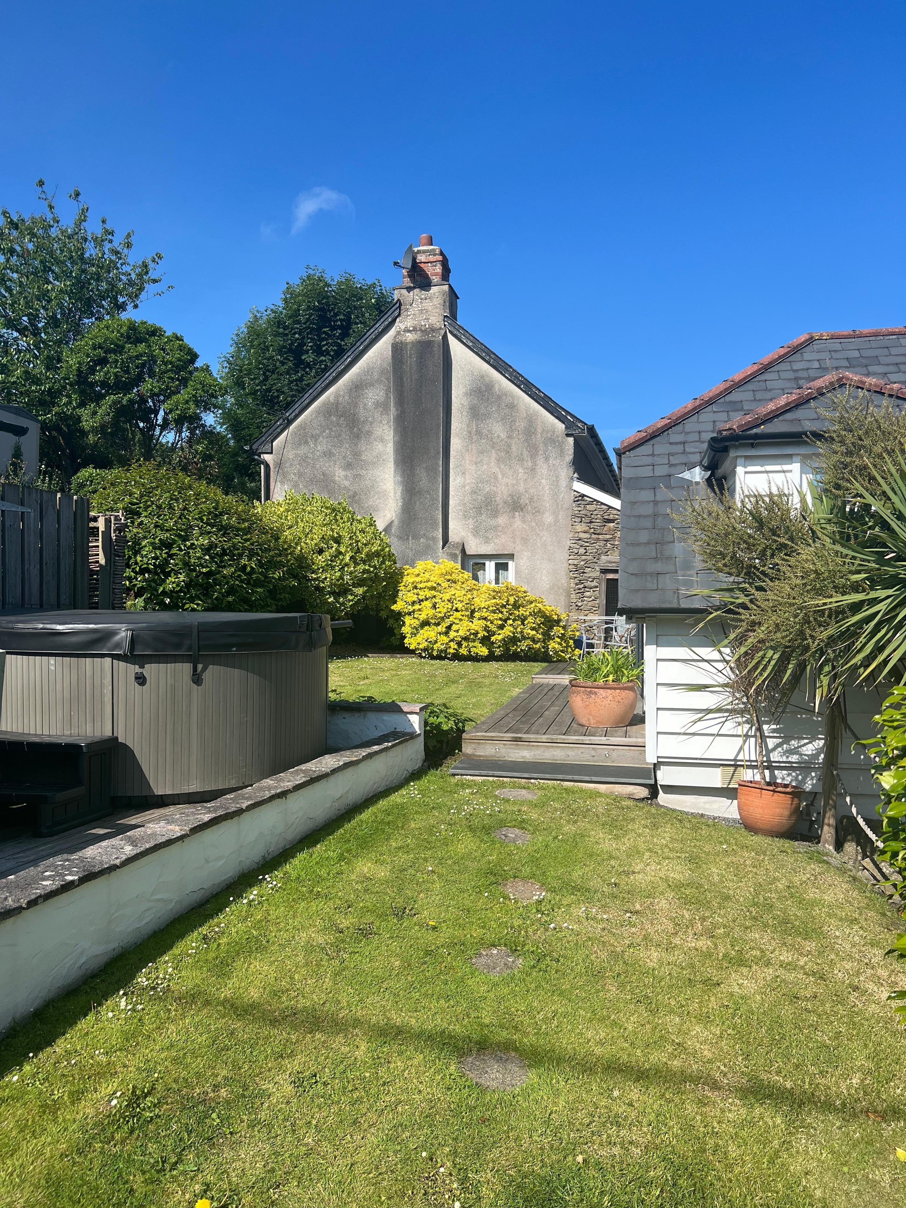 Nos portes pliantes de 3 mÚtres s'ouvrent depuis le salon sur un grand jardin mature avec pelouse et terrasse surélevée avec mobilier de salle à manger extérieur et le trÚs important bain à remous.