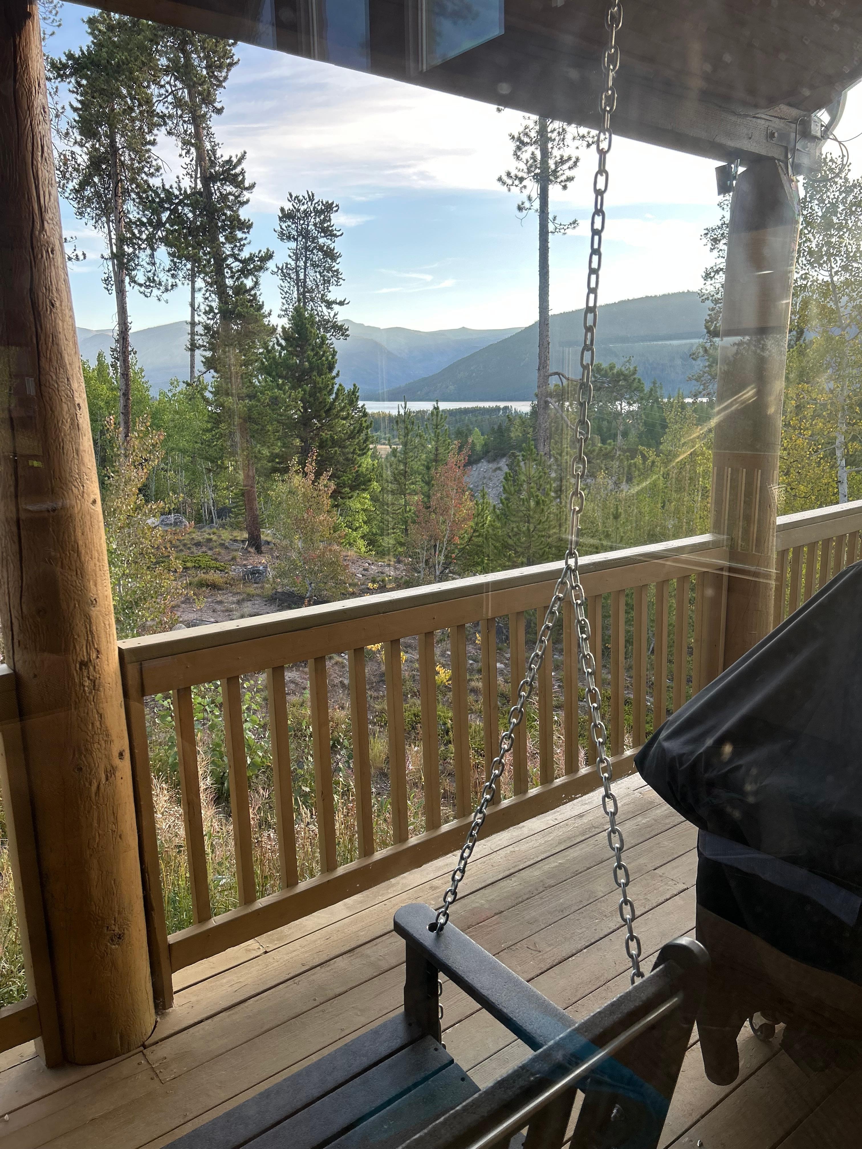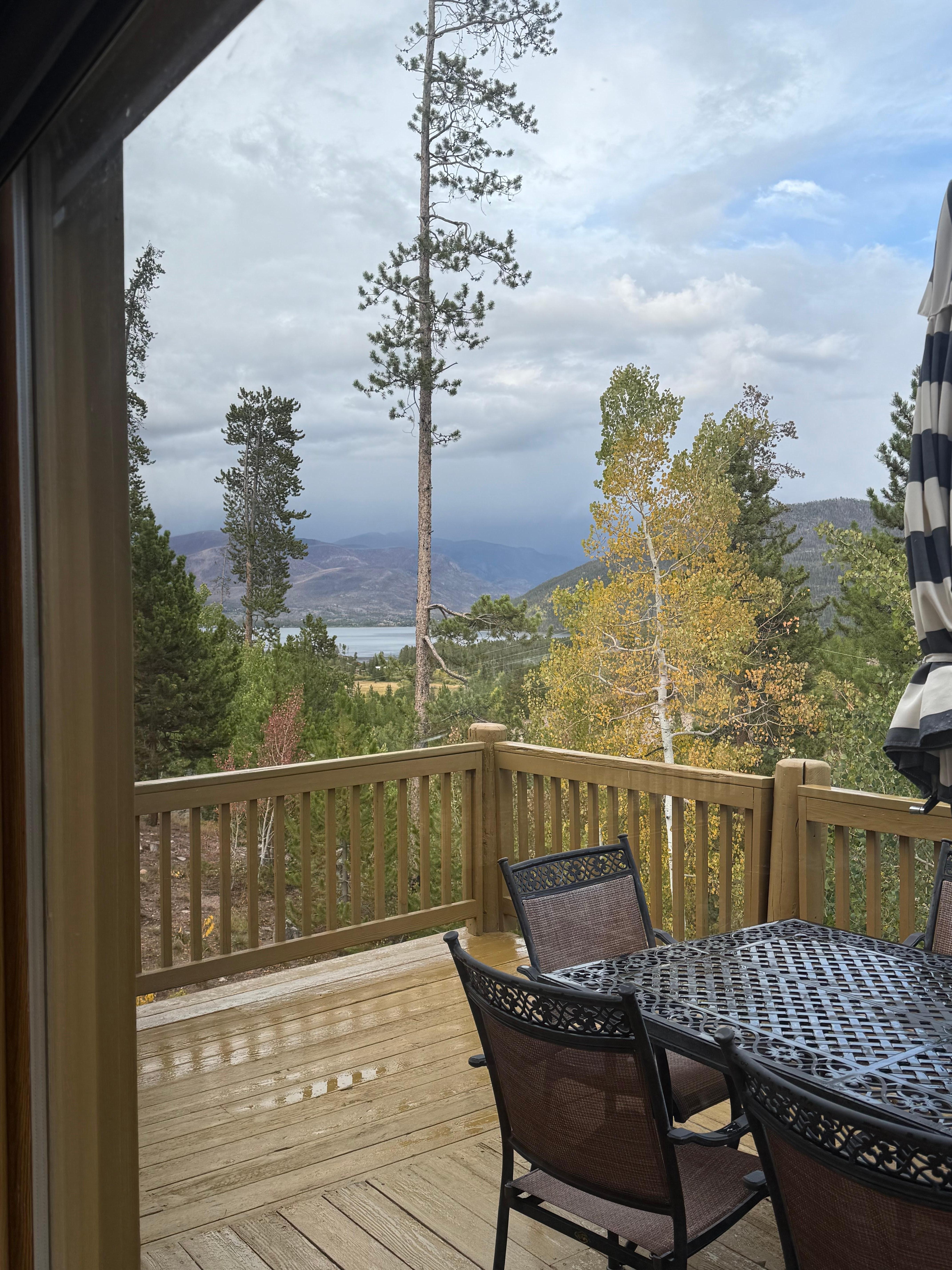 Promenez-vous dans le salon sur la grande, wrap-around pont. Nous vous proposons une table de patio pouvant accueillir six personnes avec un parapluie qui est facilement coudé ouvert et incline aussi à accueillir différentes positions du soleil. Marchez le pont vers le cÎté nord de la maison et vous trouverez une partie de la plate-forme qui est couvert. Cette zone abrite notre gril à gaz à trois brûleurs pour votre usage, et une balançoire de porche avec vue sur la montagne et des vues de Shadow Mountain Lake.