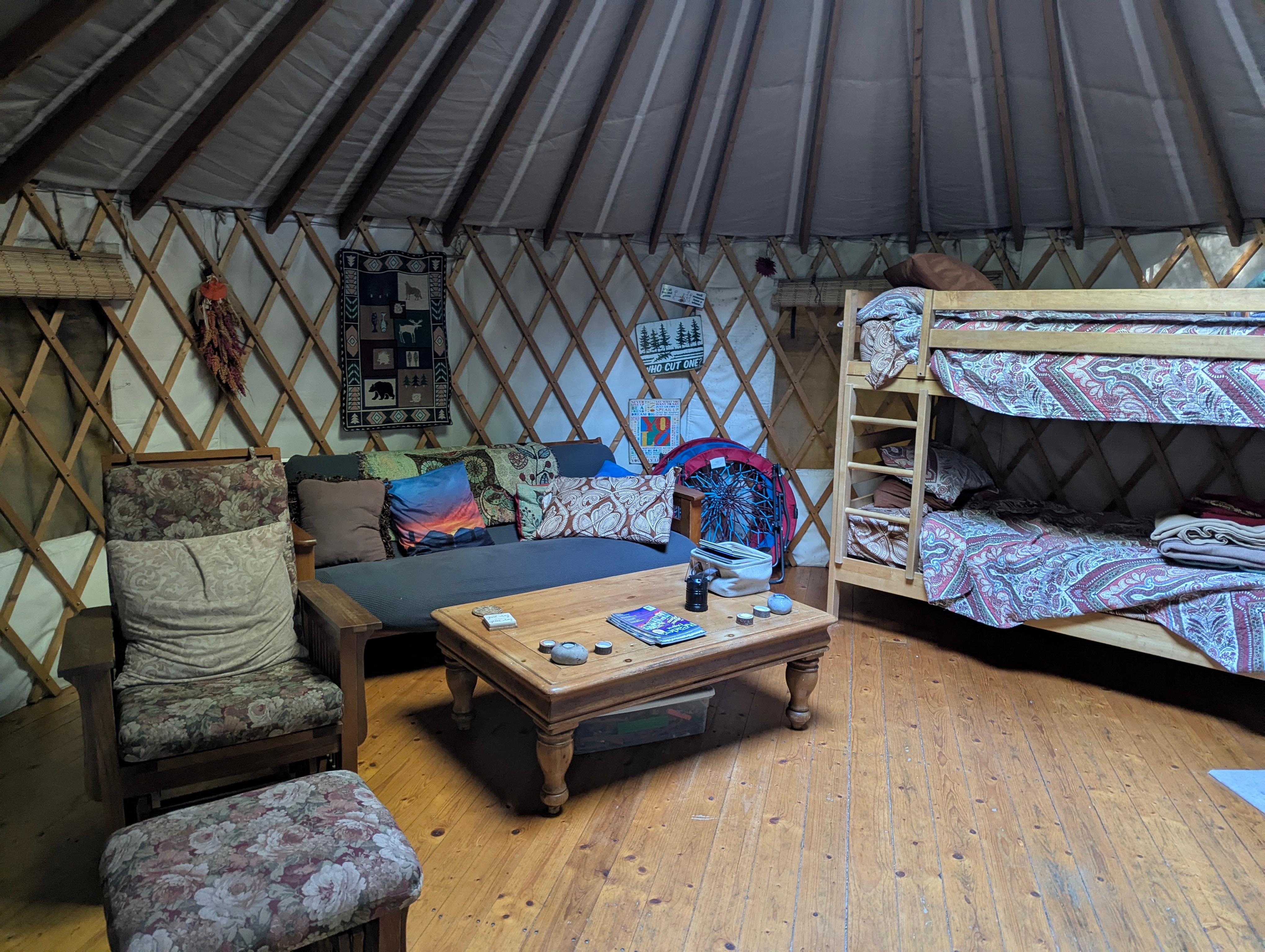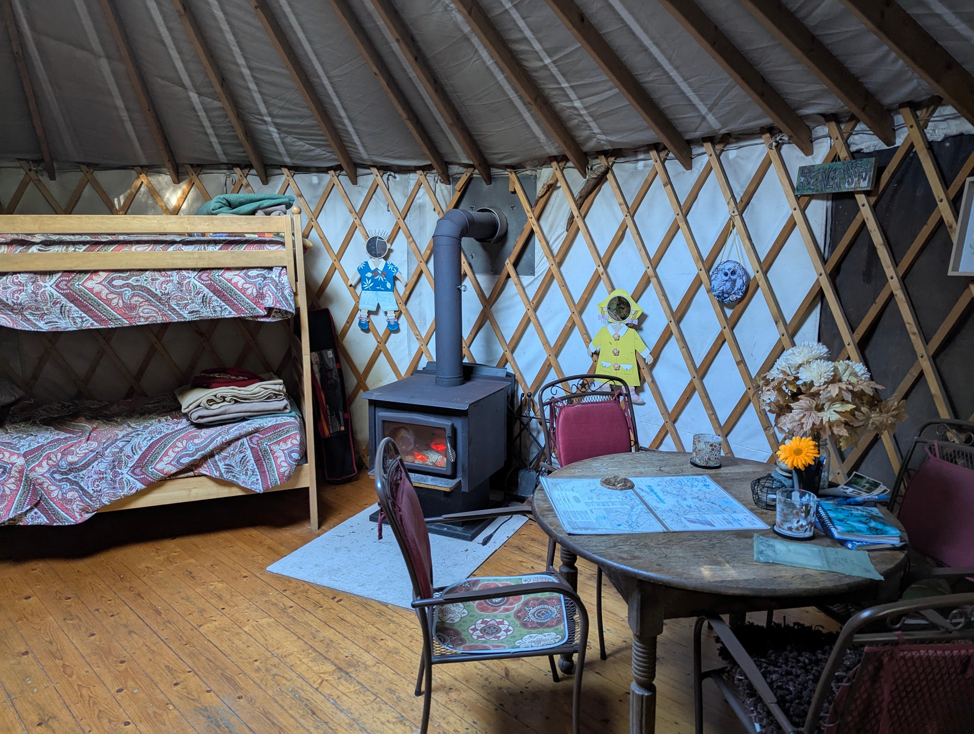 Vous pouvez profiter de notre superbe yourte avec le poĂȘle Ă bois confortable les nuits les plus fraĂźches. Il y a des frais de 20 $ inclus dans le prix du bois de chauffage pour le poĂȘle Ă bois et le foyer impressionnant et relaxant Ă l'arriĂšre. Notre yourte est accessible aux personnes handicapĂ©es, mais dans la nature. Il dort 5. Nous avons un lit superposĂ©, un futon en taille rĂ©elle et un tout nouveau lit double surdimensionnĂ©. Apportez simplement un sac de couchage pour plus de confort pour le lit si vous souhaitez un rembourrage supplĂ©mentaire. Toute la literie fraĂźche est incluse. Il y a des jeux, coloriages, livres, journaux Lincoln etc.