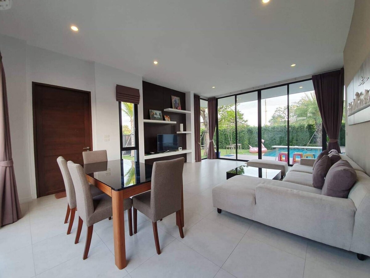 Villa moderne de 4 chambres avec piscine privée, située à WE par Sirin Soi Huahin 114, en face du parc aquatique Vananava. Notre endroit est idéal pour passer du bon temps avec la famille et les amis.