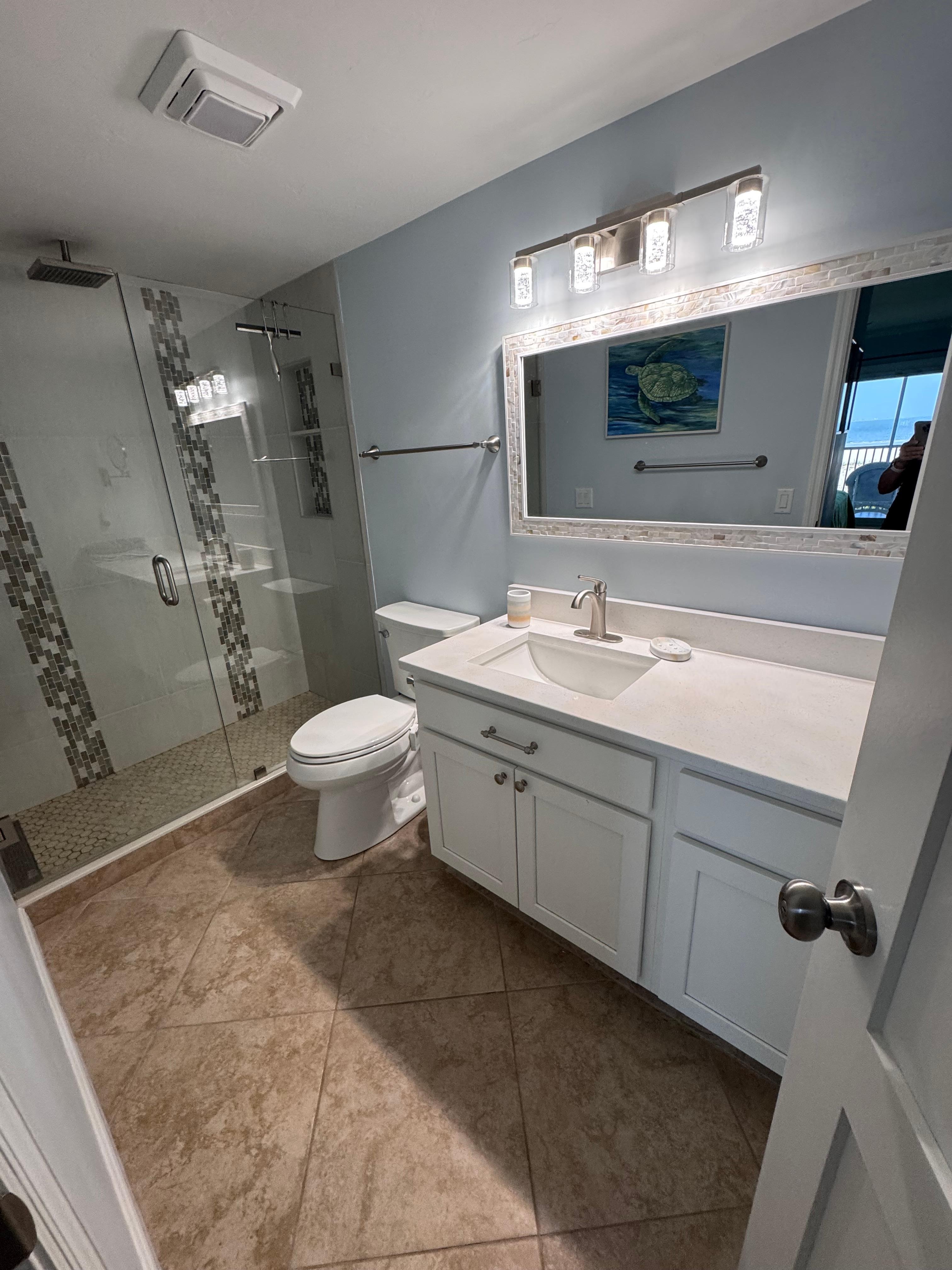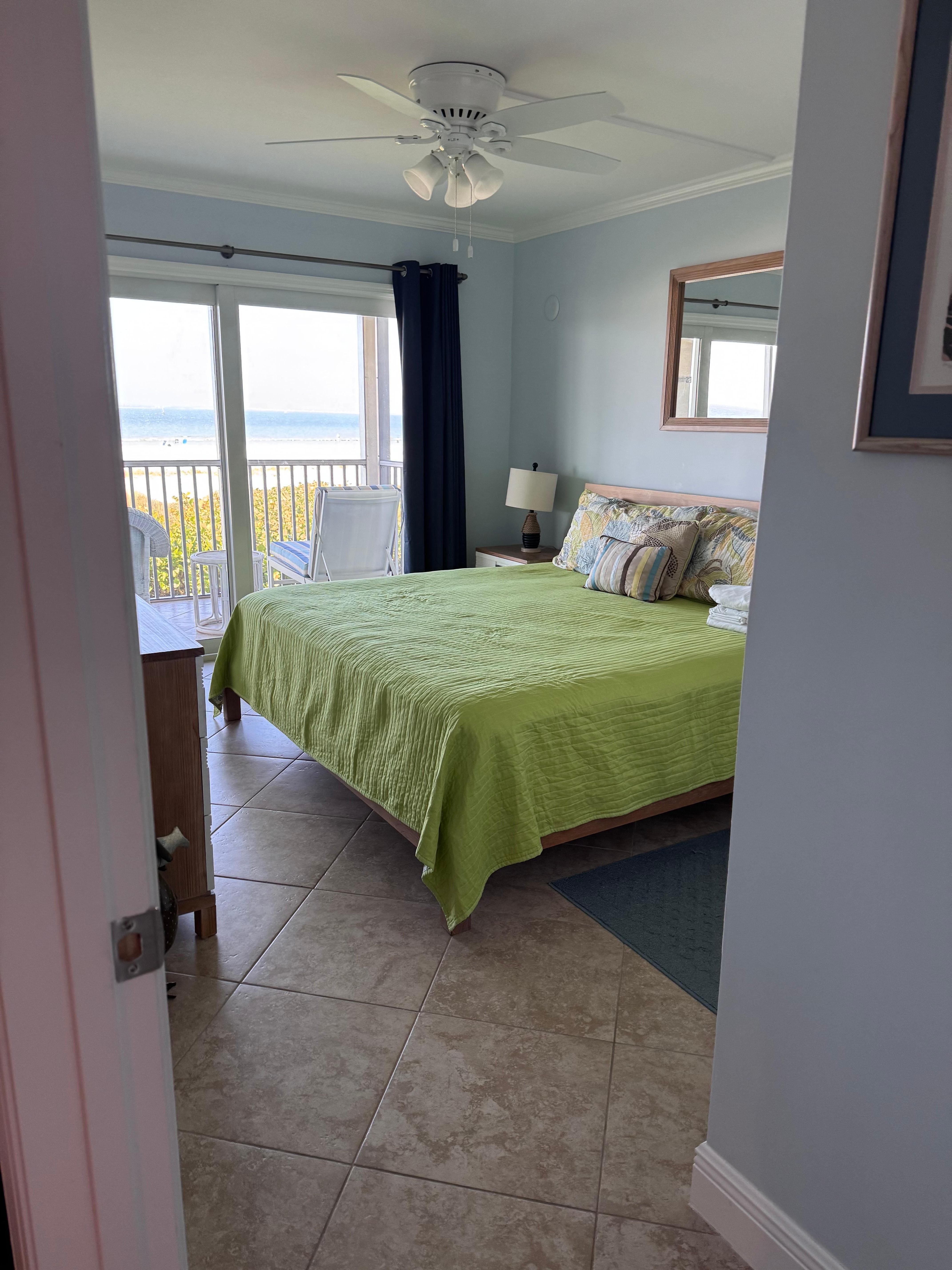 Notre condo a une suite parentale avec lit King, avec une salle de bain complÚte et un balcon avec vue sur le golfe. La chambre d'hÎtes a un lit queen avec la deuxiÚme salle de bain complÚte à proximité. Les deux chambres ont des ventilateurs de plafond et des téléviseurs à écran plat intelligents avec des options de cùble étendues. Il y a un sÚche-cheveux et du pain de savon dans chacune des salles de bains.
