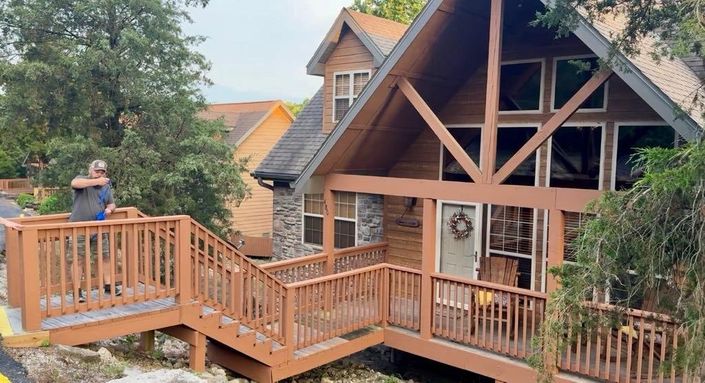 Bienvenue au Mountain Get-A-Way Lodge! Situé à West Branson, Mo Luxury 4 bedroom - 4 Bath Master Suites Lodge. Le grand porche blindé à l'arriÚre donne sur une zone boisée. C'est l'endroit idéal pour les repas, les jeux ou tout simplement pour se détendre. Nous avons équipé le lodge de 5 télévisions à écran plat, d'un lecteur DVD Blue-ray et d'Internet. La cuisine est entiÚrement équipée avec des appareils et tous les besoins de cuisine et de salle à manger.