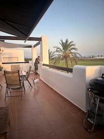 Situé dans un fantastique complexe de loisirs et de golf à proximité des plages de Mar Menor. Propriété moderne et lumineuse, bien meublée, directement sur le parcours de golf, avec climatisation, télévision par satellite et connexion Wi-Fi gratuite, une place de parking privée, emplacement central dans un environnement relaxant. Le penthouse dispose d'une terrasse spacieuse orientée plein sud, entiÚrement équipée pour profiter de la vie en plein air espagnol avec une vue imprenable sur les champs et les montagnes et donnant sur le 10e green du parcours de golf. La piscine est au 11Úme tee. Nous avons aussi des chaises longues portables. La terrasse de 40 m2 est l'endroit idéal pour profiter du soleil à toute heure de la journée sur des chaises longues et des siÚges dans le salon. ou pour prendre vos repas en plein air. La cuisine avec lave-vaisselle et machine à laver offre tout ce dont vous avez besoin pour préparer vos repas. Le linge de maison, les serviettes, etc. sont inclus.