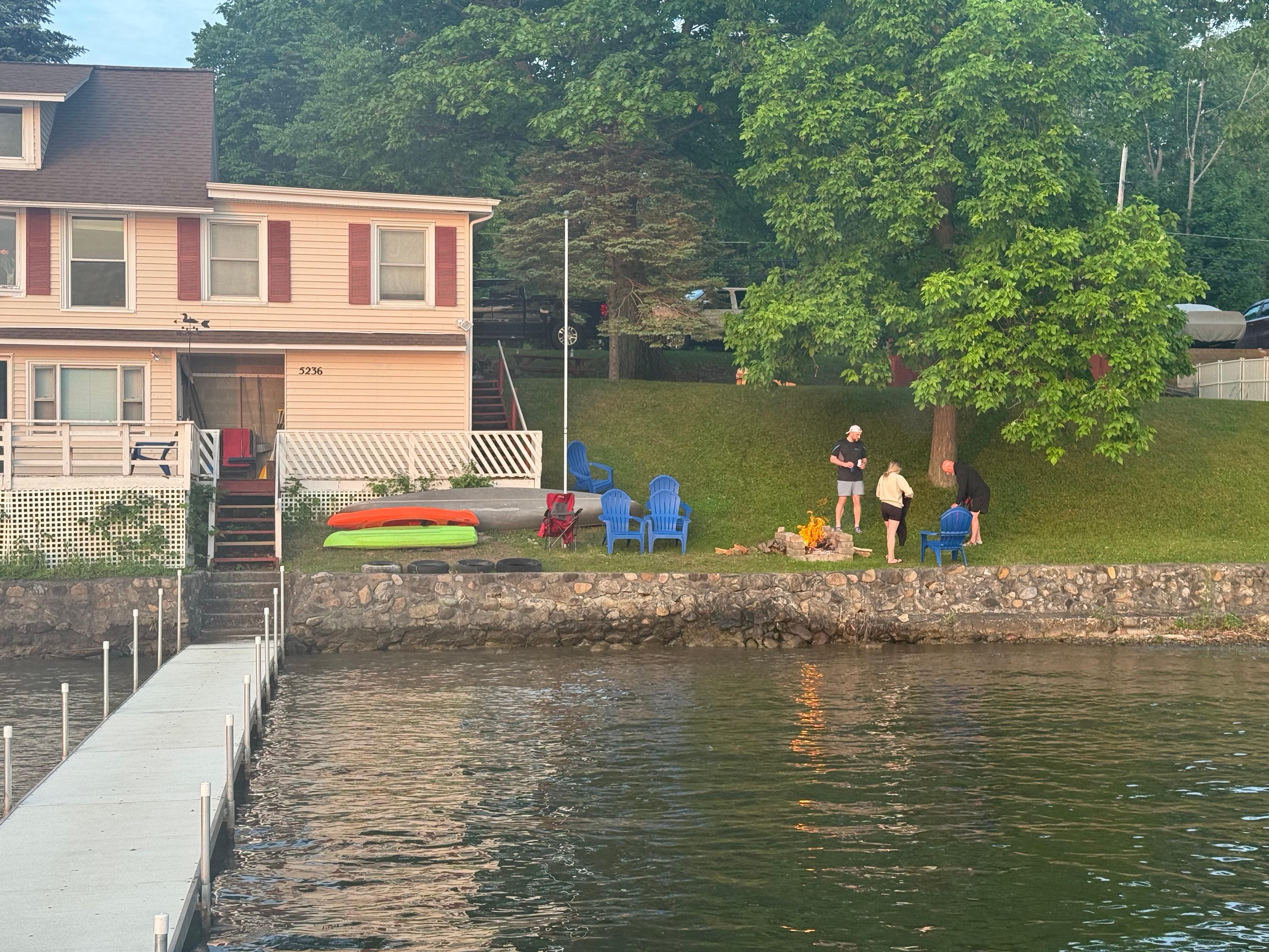 Belle maison spacieuse. Couchers de soleil magnifiques. 110 pieds de bord de lac, assurant une grande intimité. Beaucoup de stationnement (5 voitures dans l'allée et plus à travers st.). 3br. 2. 5 ba. Peut accueillir jusqu'à 12 personnes. Voir le lac depuis chaque piÚce de la maison! Le niveau principal a un grand salon / salle à manger donnant sur le lac, avec télévision à écran plat de 48 ", cuisine avec lave-vaisselle, vestiaire avec laveuse / sécheuse, 2 chambres et une salle de bain complÚte. La chambre principale a un lit King et surplombe le lac. La deuxiÚme chambre a un lit queen et offre également une vue sur le lac. A l'étage se trouve une immense suite de chambre qui donne également sur le lac. Cette chambre a un lit Queen, un lit double, un futon et une demi-baignoire. Le rez-de-chaussée est une grande salle familiale qui surplombe également le lac et a un réfrigérateur, une table de billard, une table avec 6 siÚges, une salle de bain complÚte, un deuxiÚme coin salon, y compris une télévision de 32 "et un canapé-lit. Du rez-de-chaussée, sortez sur une grande terrasse avec beaucoup de siÚges. 2 kayaks, un canot, une chaloupe et de nombreux gilets de sauvetage sont inclus dans la location. Il y a un long quai avec beaucoup d'espace si vous apportez un bateau. Bonne profondeur d'eau avec grande zone de baignade également. Il y a 2 foyers à l'extérieur, un gril à gaz et une table de pique-nique. Un court trajet en voiture des domaines viticoles Eagle Crest & Deer Run, Minnehans Fun Center, de nombreux excellents restaurants, épiceries et plus encore.