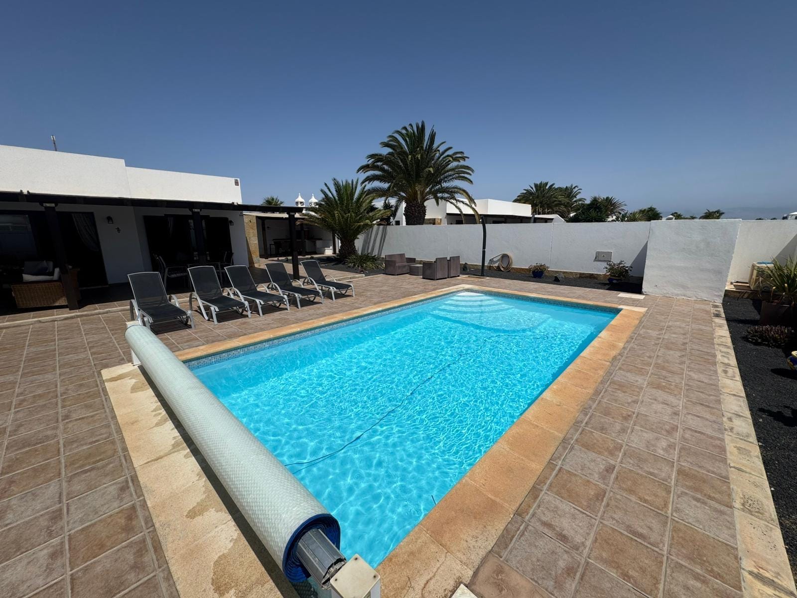 Il y a un parking couvert à l'avant. C'est une agréable promenade de 20 minutes à l'avant de Playa Blanca avec ses nombreux bars, restaurants et plages.