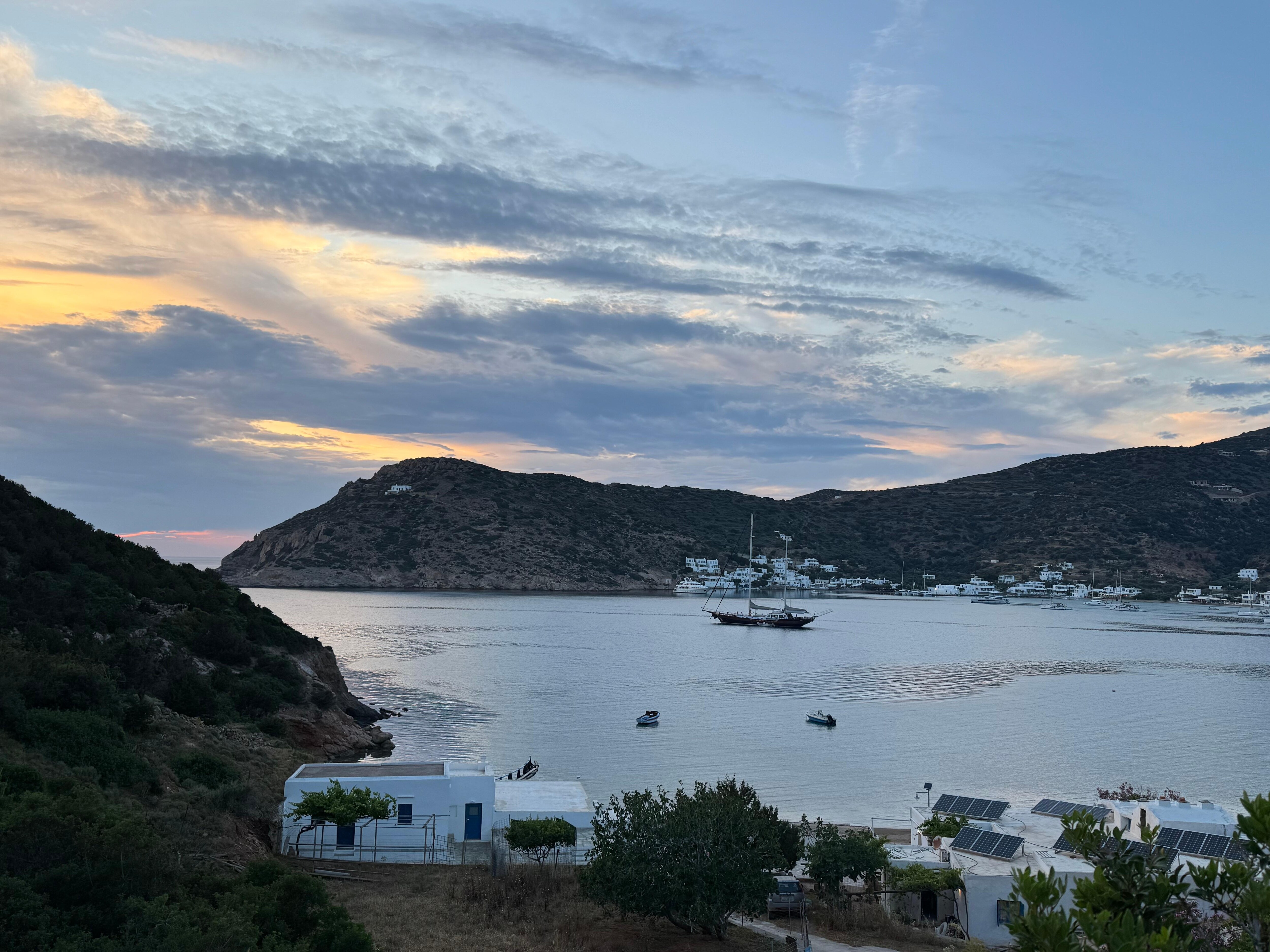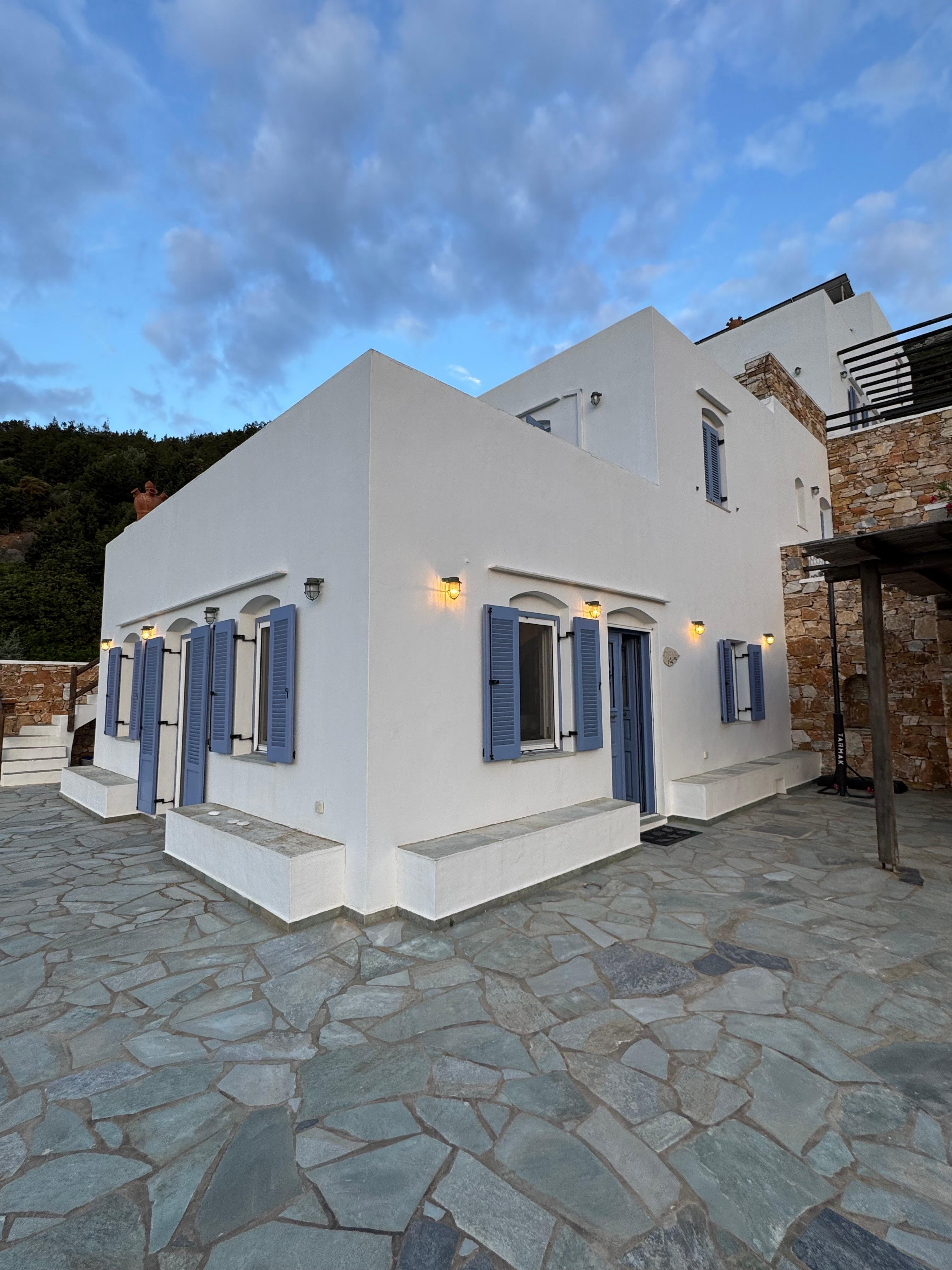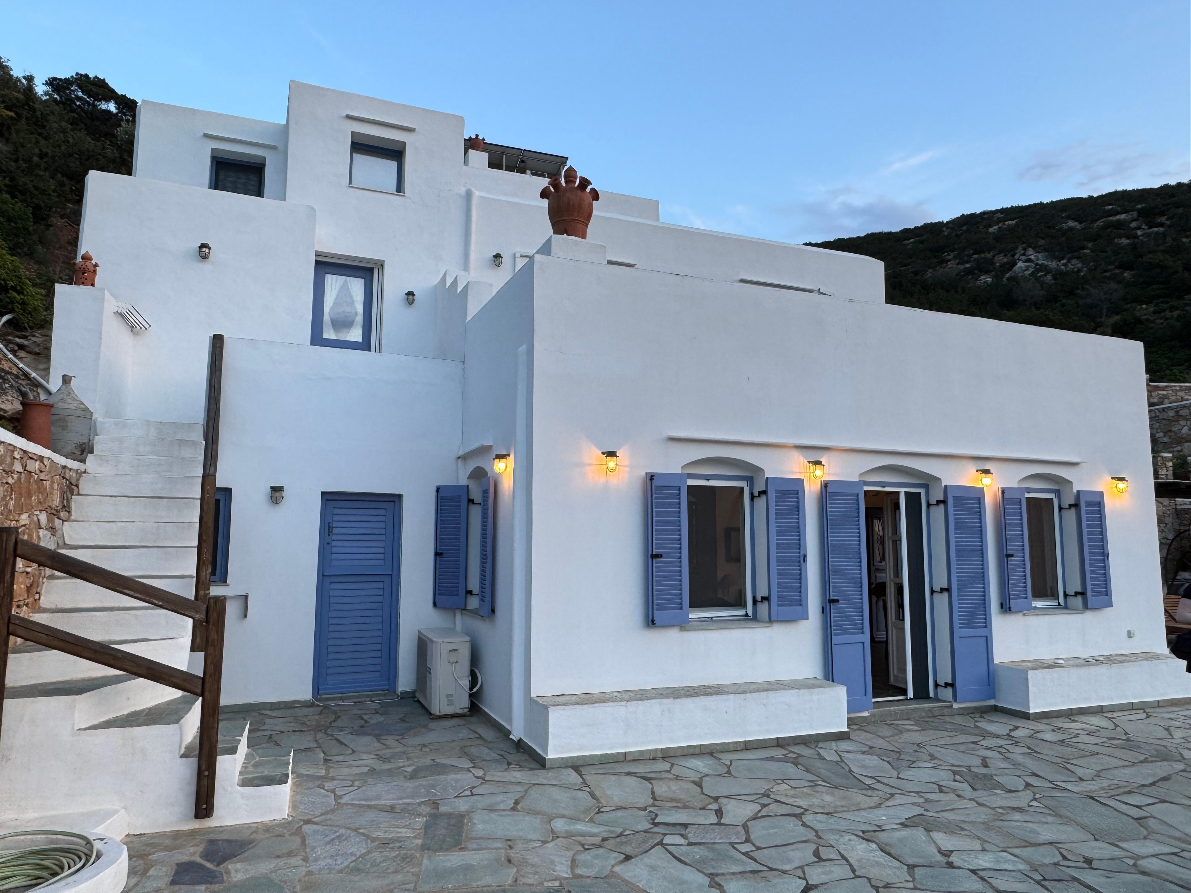 La villa a une magnifique vue panoramique. Le patio du rez-de-chaussĂ©e et les belles vĂ©randas des deux Ă©tages rĂ©vĂšlent la vue sur la baie de Vathy et les montagnes Ă lâarriĂšre-plan. Le visiteur peut se dĂ©tendre sur les chaises longues Ă l'ombre de la pergola en bois ou profiter des chambres confortables de cette maison cycladique traditionnelle.