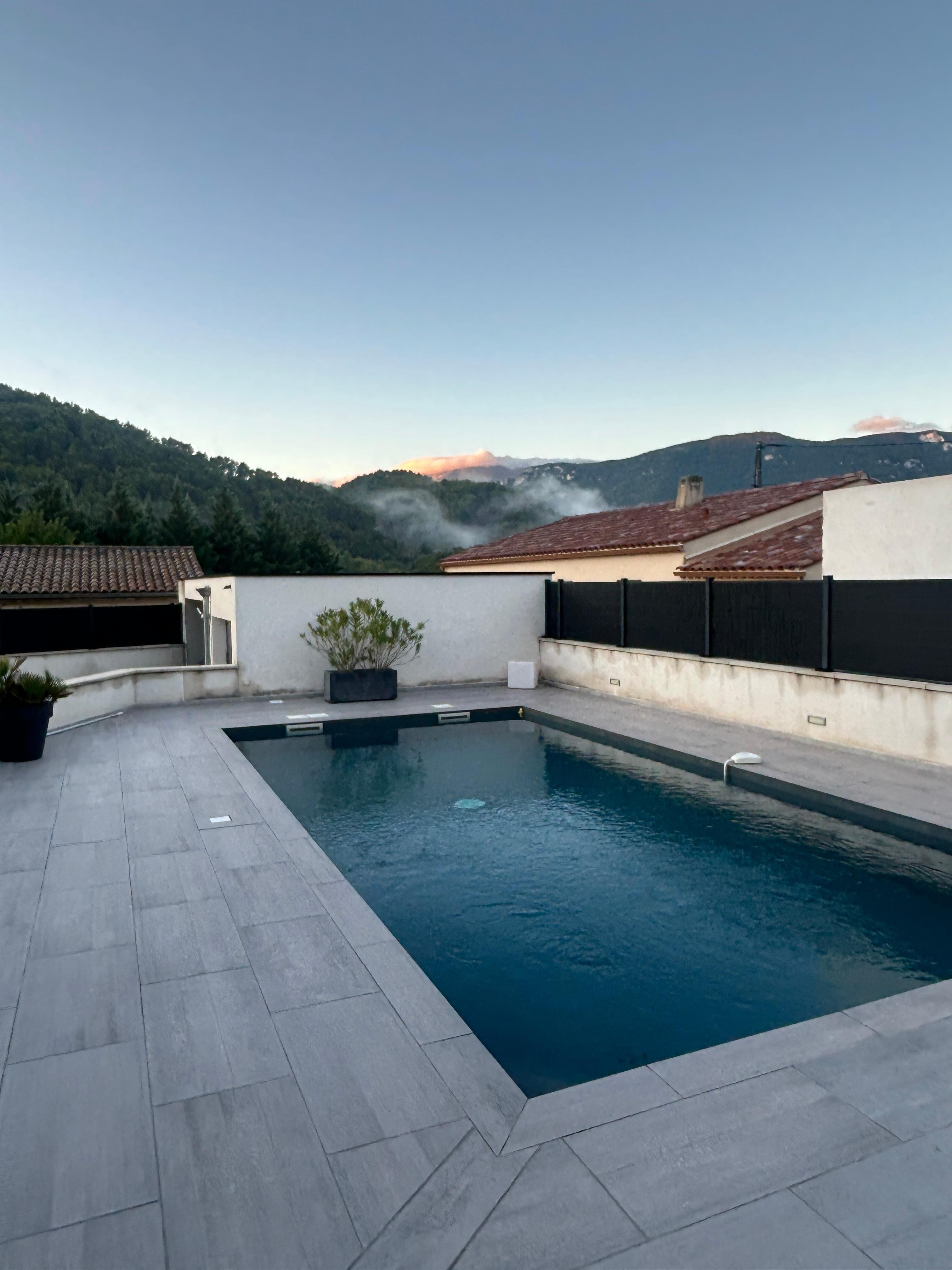 Maison neuve composée de 2 chambres double et d'un dortoir enfants sur un terrain de 500m2 avec piscine.