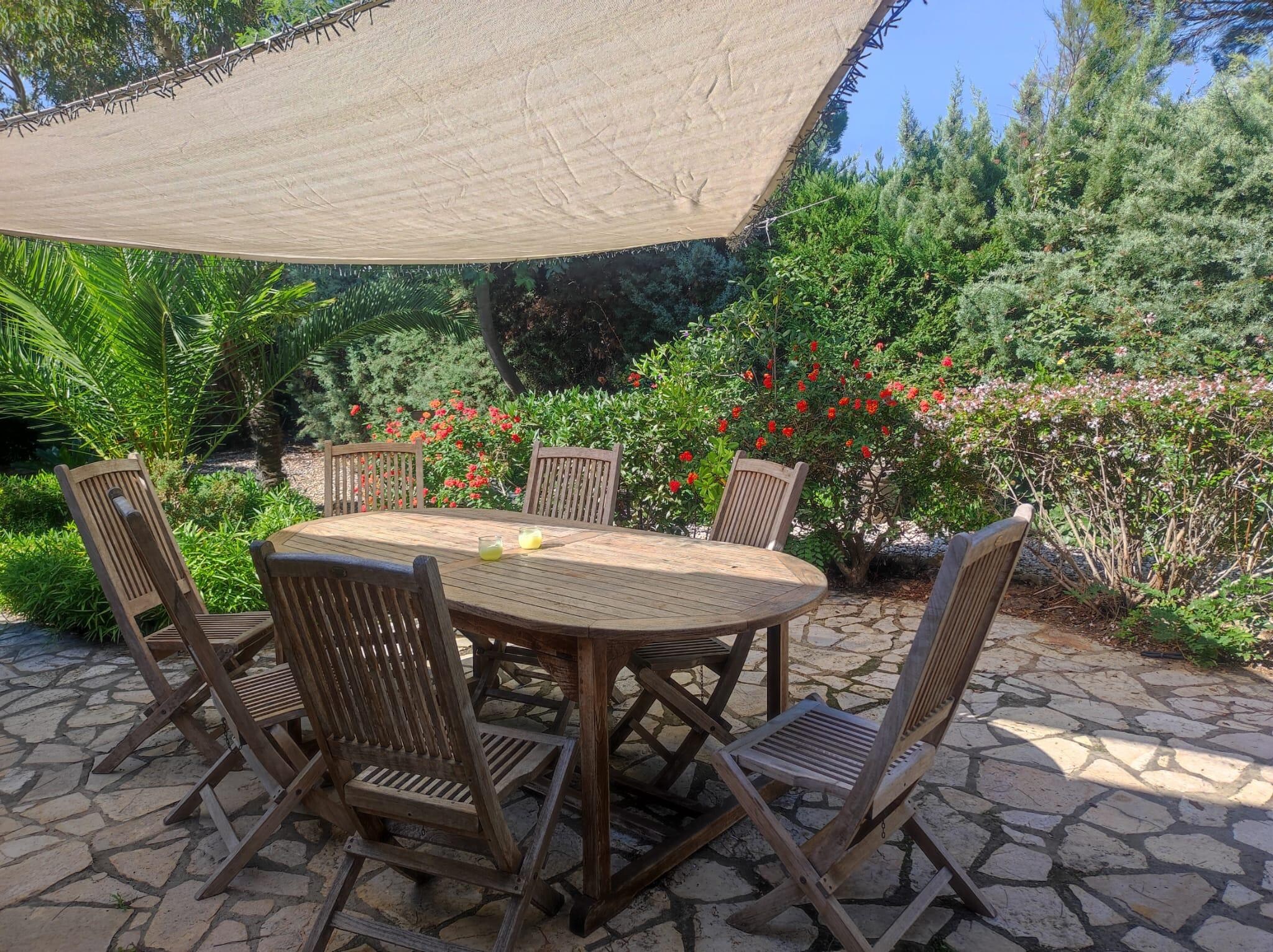 Grande terrasse ombragée sous toit végétal ( Glycine), mobilier de jardin en teck et en résine tressée.