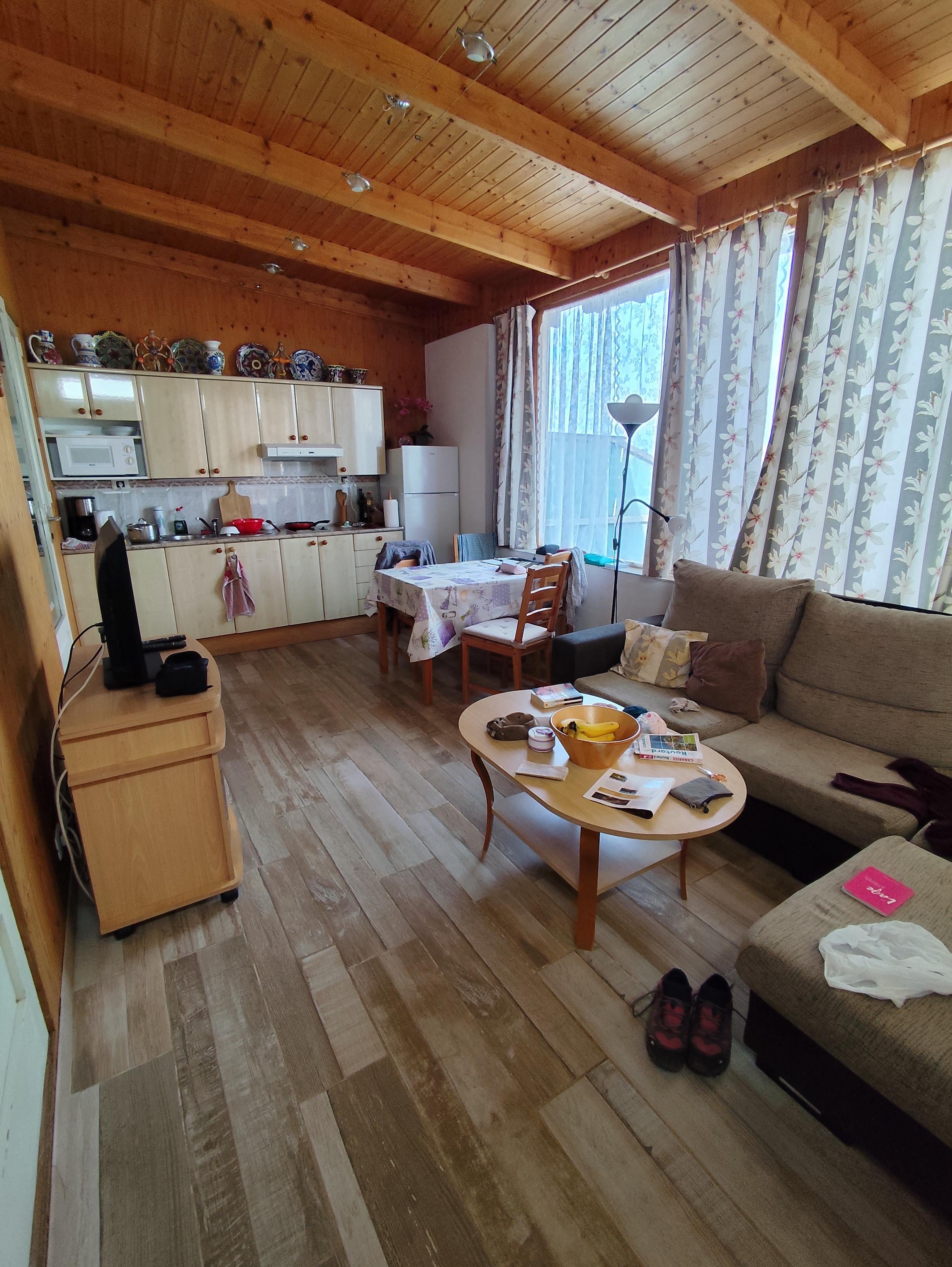 Chalet en bois Ă l'intĂ©rieur dans un style finlandais. Il se compose de 2 chambres, une avec un lit double et une avec 2 lits simples. La maison a une cuisine-salle Ă manger avec un canapĂ©, une salle de bain, un petit patio intĂ©rieur pour les vĂȘtements et un grand jardin privĂ© avec de petites vues sur la mer, ce qui est parfait pour les couples en quĂȘte de repos, pour les surfeurs et les vĂ©liplanchistes avec ses tables et son Ă©quipement, ainsi que pour les familles avec enfants qui souhaitent profiter d'un grand espace de jeux. Le jardin est Ă©quipĂ© d'un barbecue pour griller Ă l'extĂ©rieur.