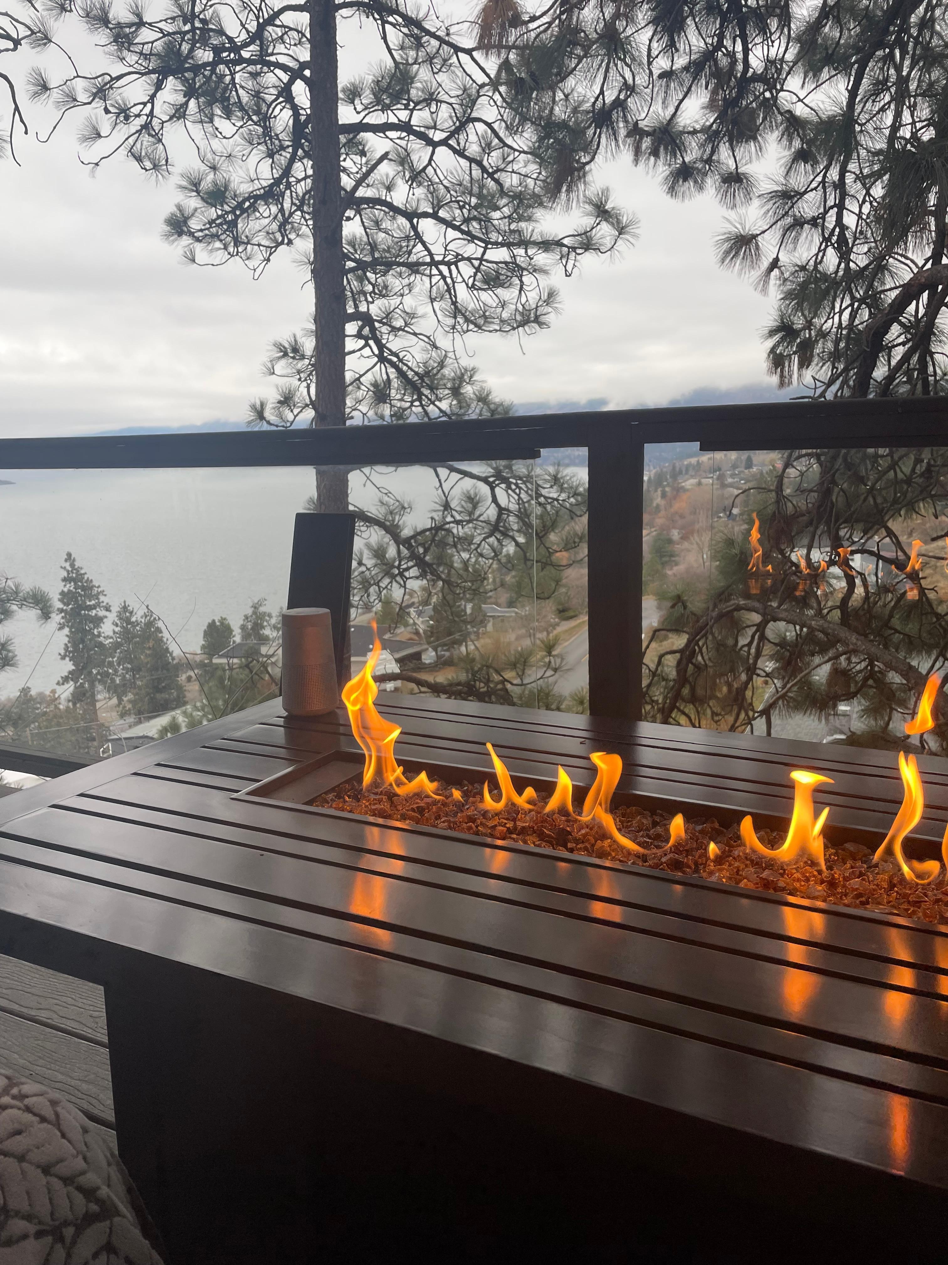 Vous ouvrez la porte et montez sur votre terrasse privée avec une vue OMG au sud du lac Okanagan. Le pont est aménagé parmi les pins ponderosa et vous aurez de nombreux visiteurs à plumes. Le toit du pont est soutenu par de lourdes poutres en sapin avec des aigles sculptés.