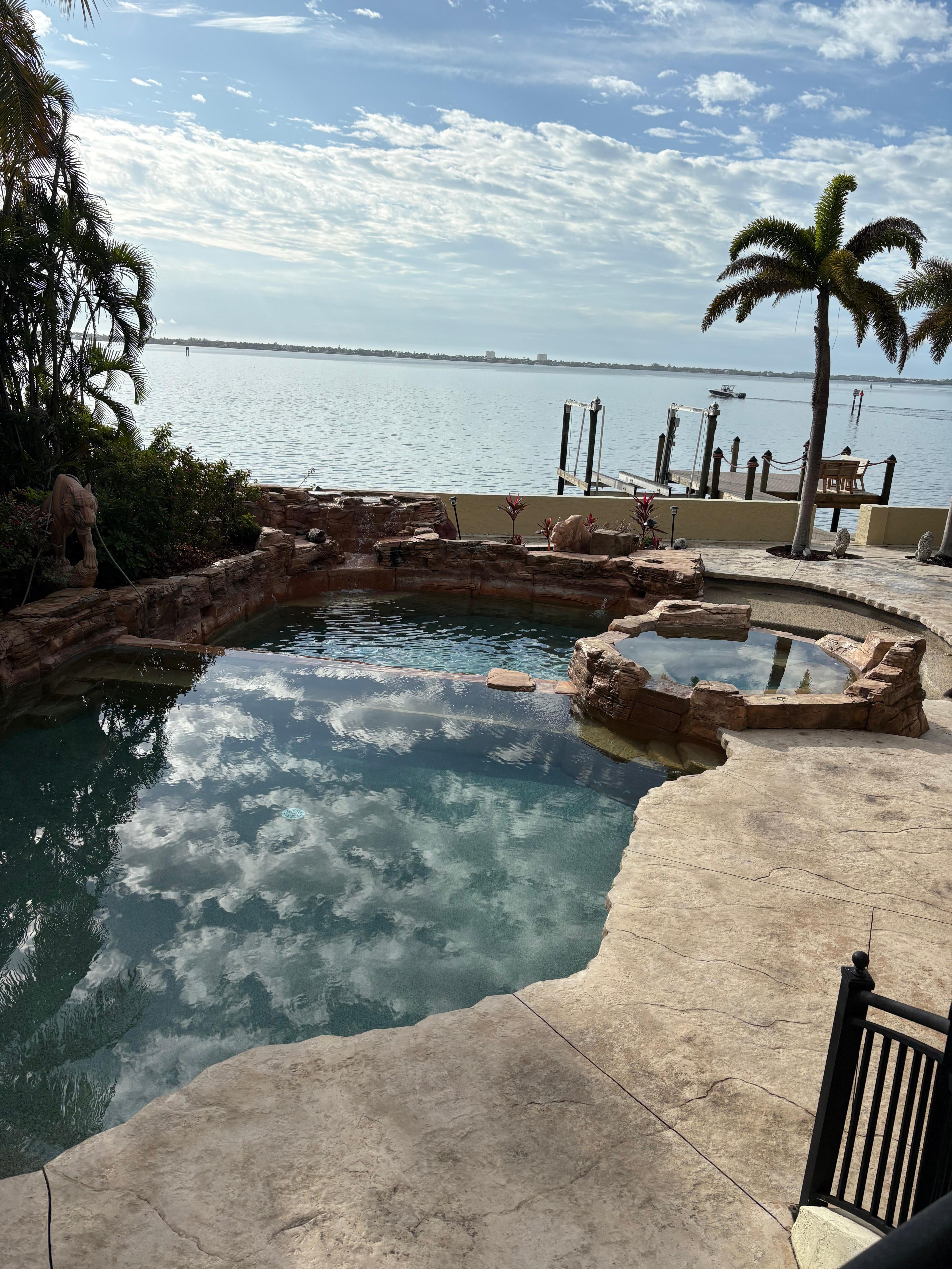 Le domaine de Winslet a une véranda de style complexe et une piscine, et offre une grande piscine divisée par une cascade sur un côté et offrant des sièges autour de la circonférence. Une autre cascade de roches est située dans le coin de la piscine. Détendez-vous dans le spa intégré et regardez les bateaux passer dans le golfe du Mexique. De nombreux salons de bronzage sont disponibles, ce qui facilite la pose au bord de la piscine et le soleil. Niché à l'écart de la piscine se trouve une salle à manger ombragée séparée et plus privée.