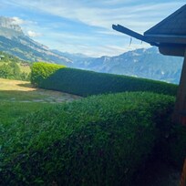 A l'extérieur : jardin clos, ensoleillé, équipé d'un mobilier de jardin pour 6 personnes. Situé en bordure des prés, il possÚde une belle vue sur les chaßnes de montagnes des Aravis, des Fiz, et du Mont Blanc.