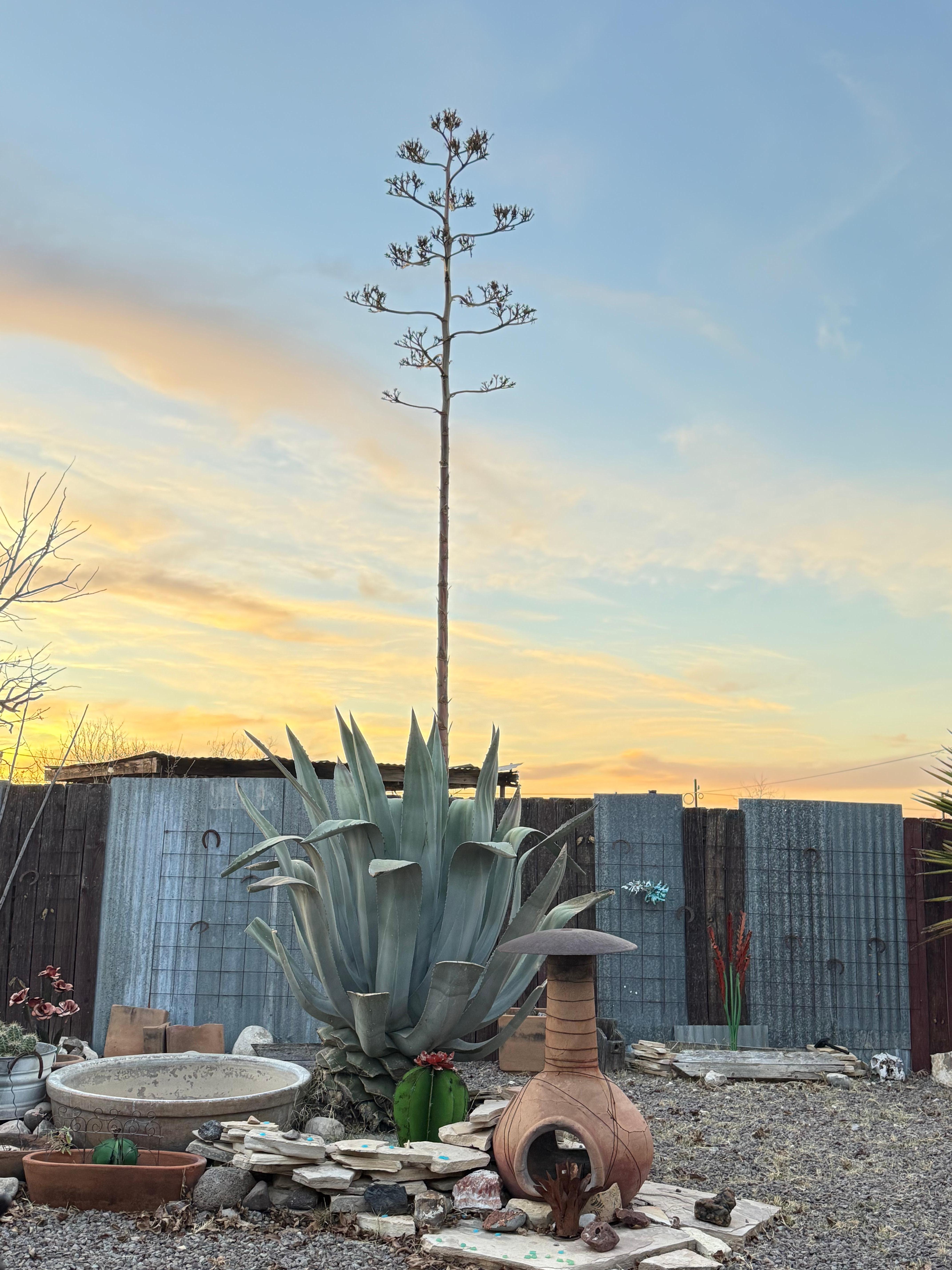 Bel espace extérieur aménagé avec des plantes du désert régionales, terrasse couverte, salle à manger pour 6 personnes avec 2 bancs mexicains antiques et barbecue au gaz.