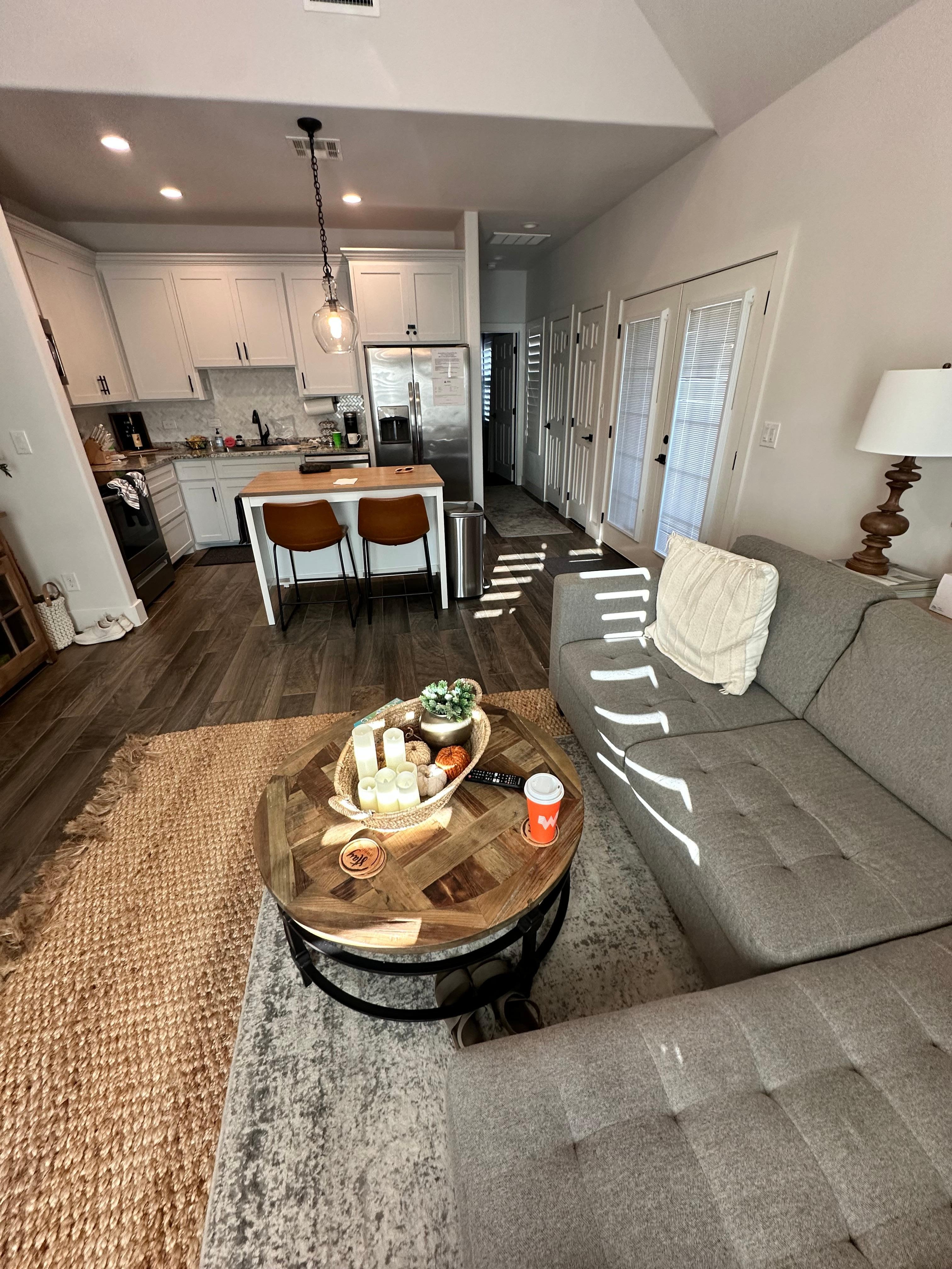 Conveniently located between Main Street and Wine Road 290, Stay Awhile is the perfect couples retreat decked out in modern furnishings. The open concept living and dining area combines comfort and luxury and has everything you need to whip up a gourmet meal or enjoy the Smart TV from the comfy sofa. Just outside on the spacious private patio, wind down after a beautiful day in the Hill Country with a glass of wine. The private bath offers upscale finishes and plenty of room to get ready for the day. At night, retreat to the king bedroom adorned with a shiplap accent wall and furnished with crisp white linens. âStay Awhileâ and enjoy all this newly constructed suite has to offer.