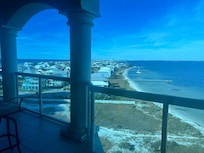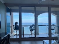 STEP OUTSIDE: Covered balcony w/ outdoor living room, gas grill, Gulf of Mexico views & patio furniture