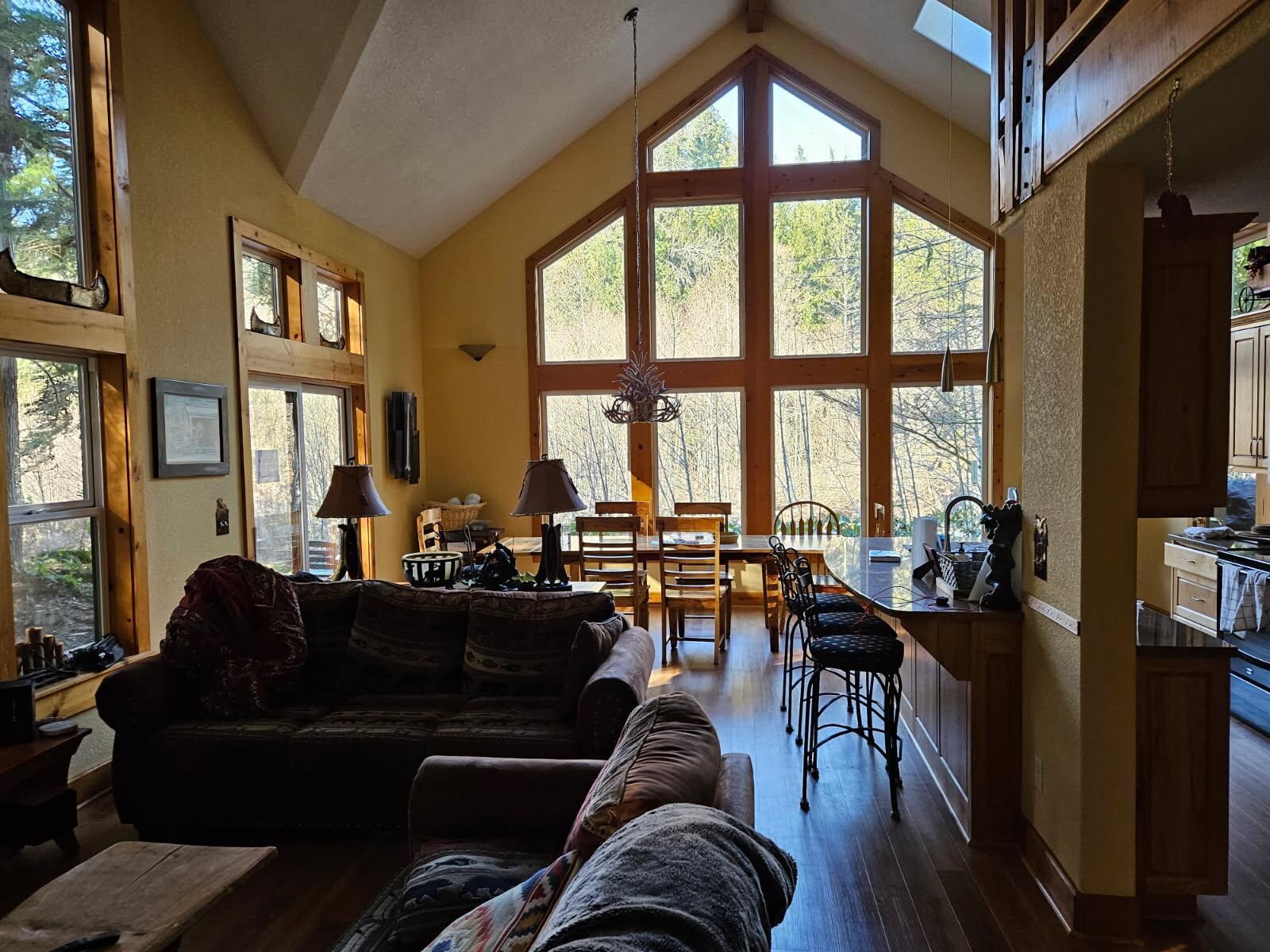 The vaulted great room is perfect for a gathering of friends and family who like to cook with the spacious open kitchen and second prep area with its own sink. You can sit around the large dining table for dinner and enjoy the river and mountain views through the floor-to-ceiling picture windows. The wood-burning fireplace warms the home and adds to the mountain lodge ambiance.